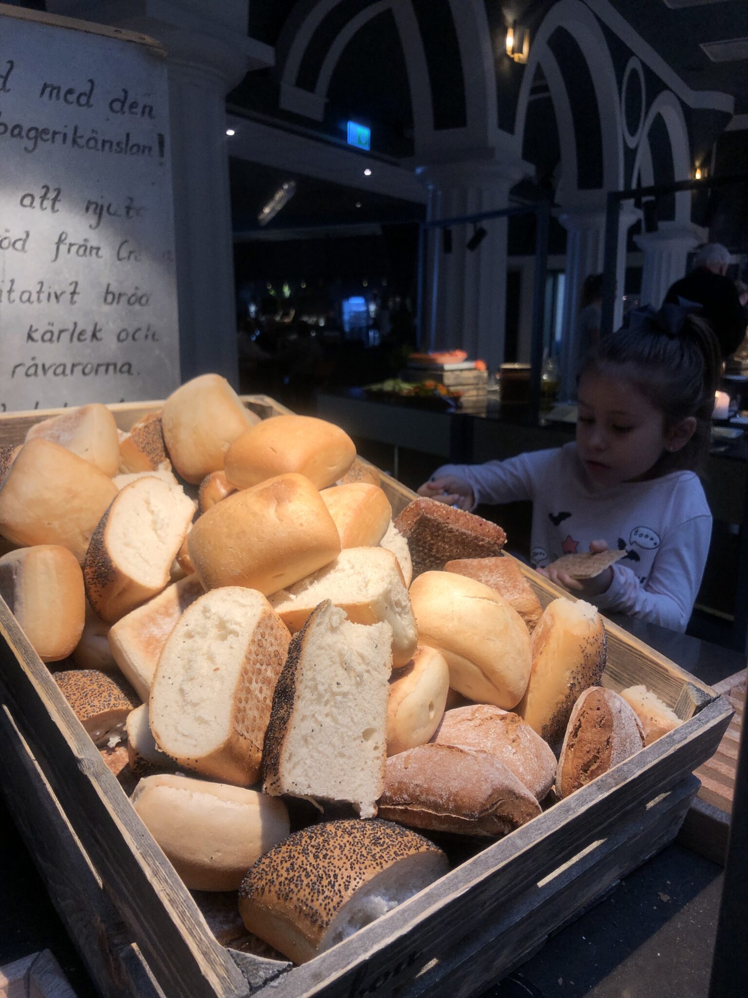 Här börjar Amina med lite gott nybakat bröd. Vi blev osams först för det fanns ett pannkaksbord med 900 olika sorters sockerinnehållande toppings som hon menade att hon skulle börja med men det gick tyvärr inte för sig.