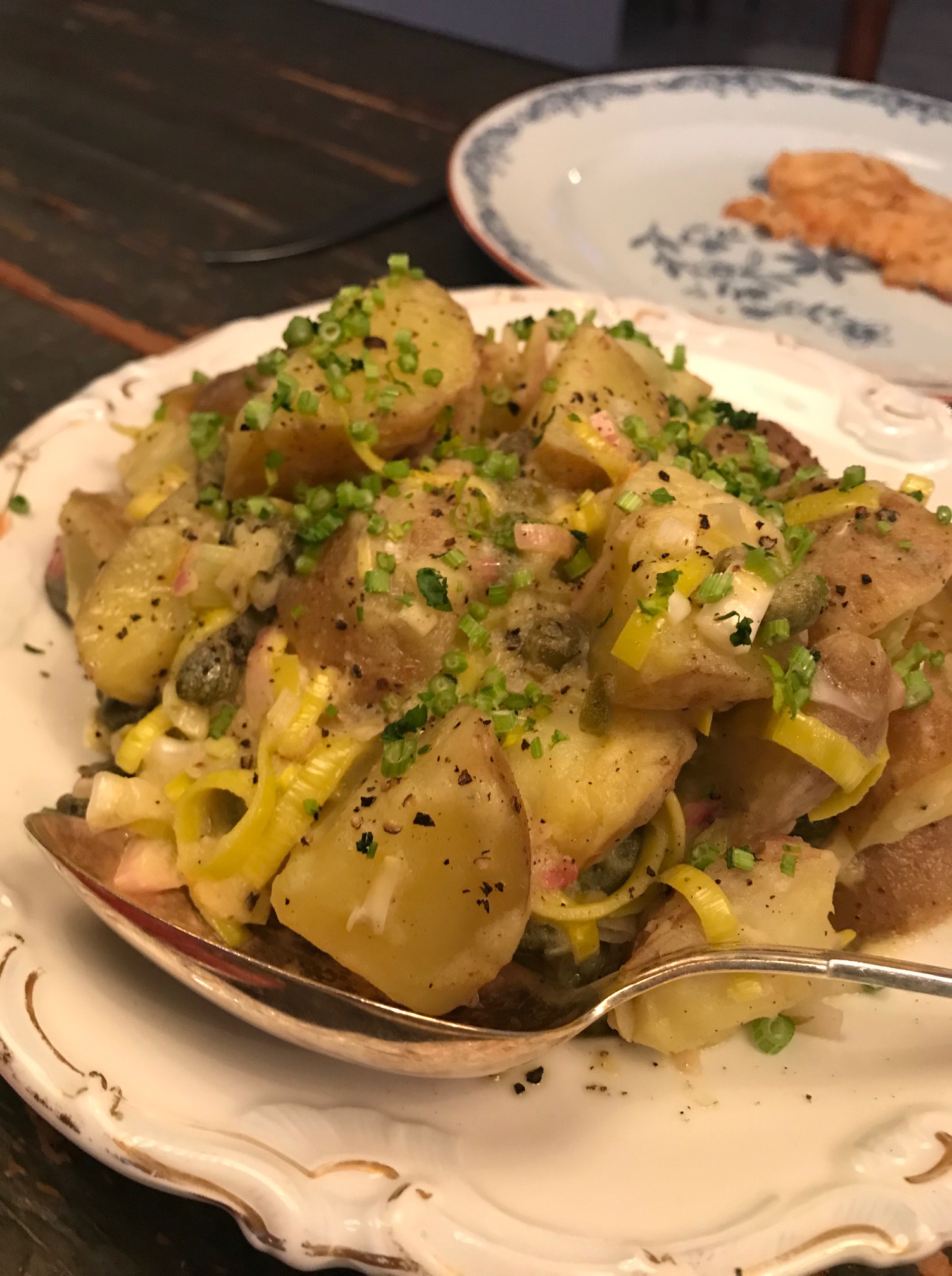 Det fanns några potatisar och en halv och trött purjolök och en burk med typ 13 kaprisar kvar i och det fick bli en fransk potatissallad. Godare än ”vanlig” med majonäs. Sån potatissallad kräks jag av. (recept på vår franska potatissallad får ni när jag är frisk för jag måste fråga ut min sambo som lagade all mat igår, se detta som inspo).