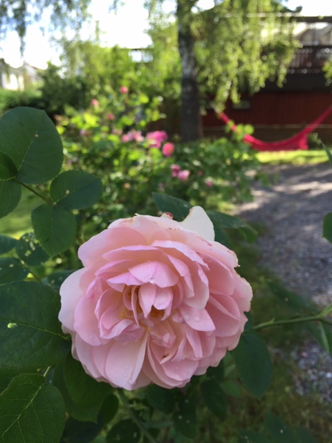 Jag har bara storblommande täta remonterande rosa rosor. Rossnobbarna fnyser åt dessa delvis manipulerade rosor men bor man i ett land som vårt där sommaren är så kort så vill jag att rosorna ska orka blomma mer än en gång. Tyvärr orkar dom inte alltid blomma oavbrutet och dofta så vill man ha parfymdoftande rosor får man köra den gamla sorten.