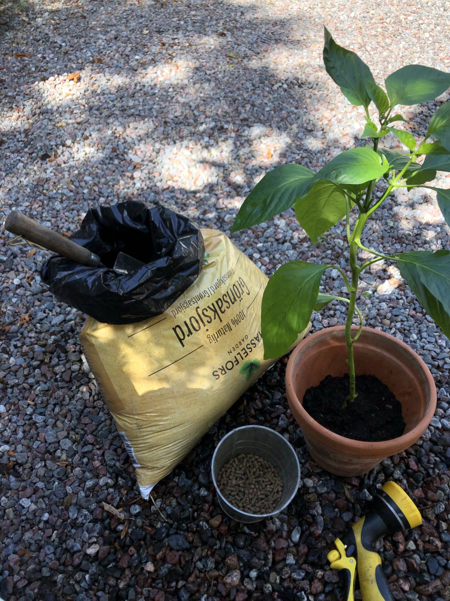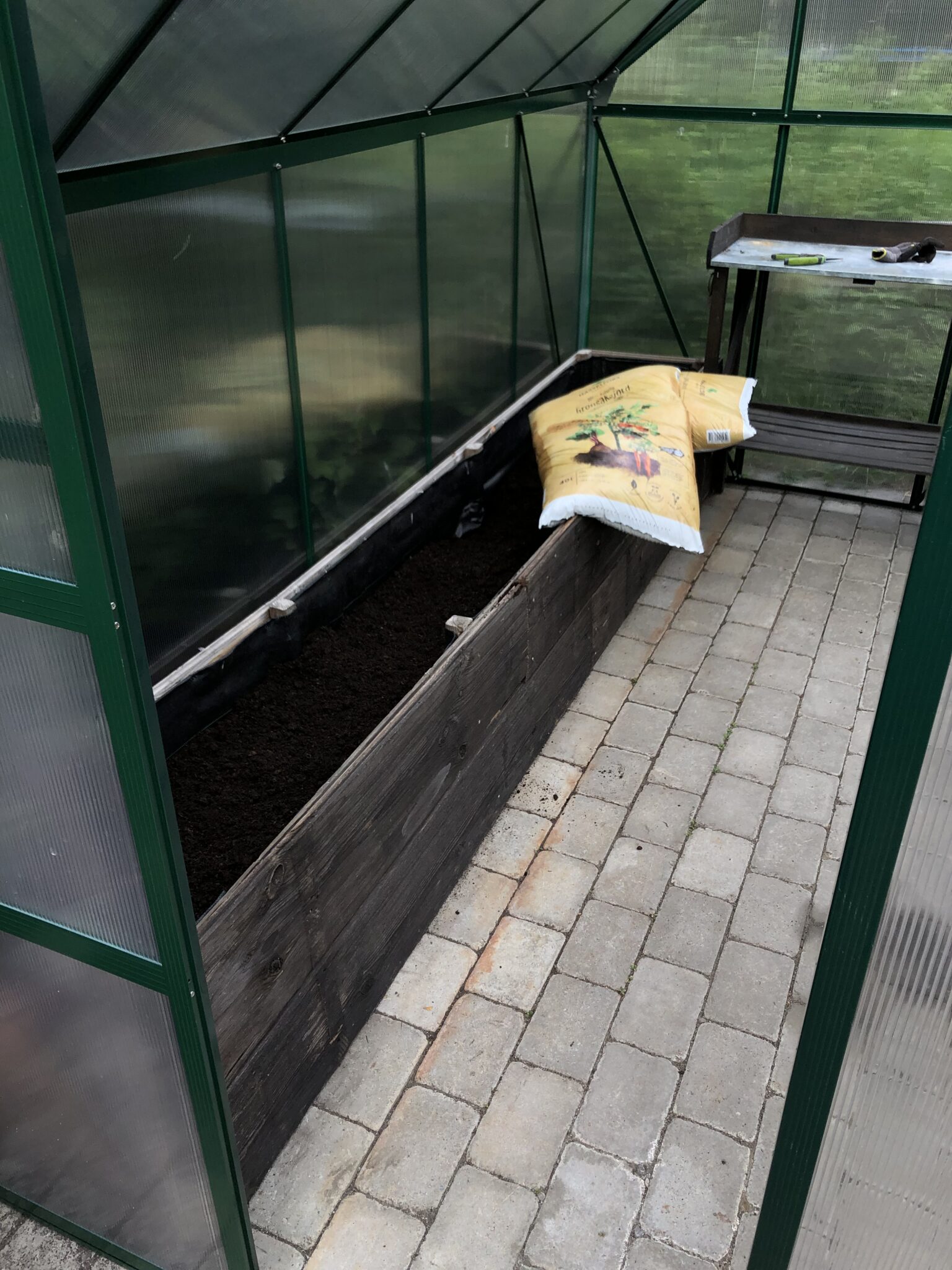 Grönsaksjorden fyller jag i odlingslådan som vi byggt inne i växthuset för tomater men också alla krukor som jag ska odla paprikor och annat i.
