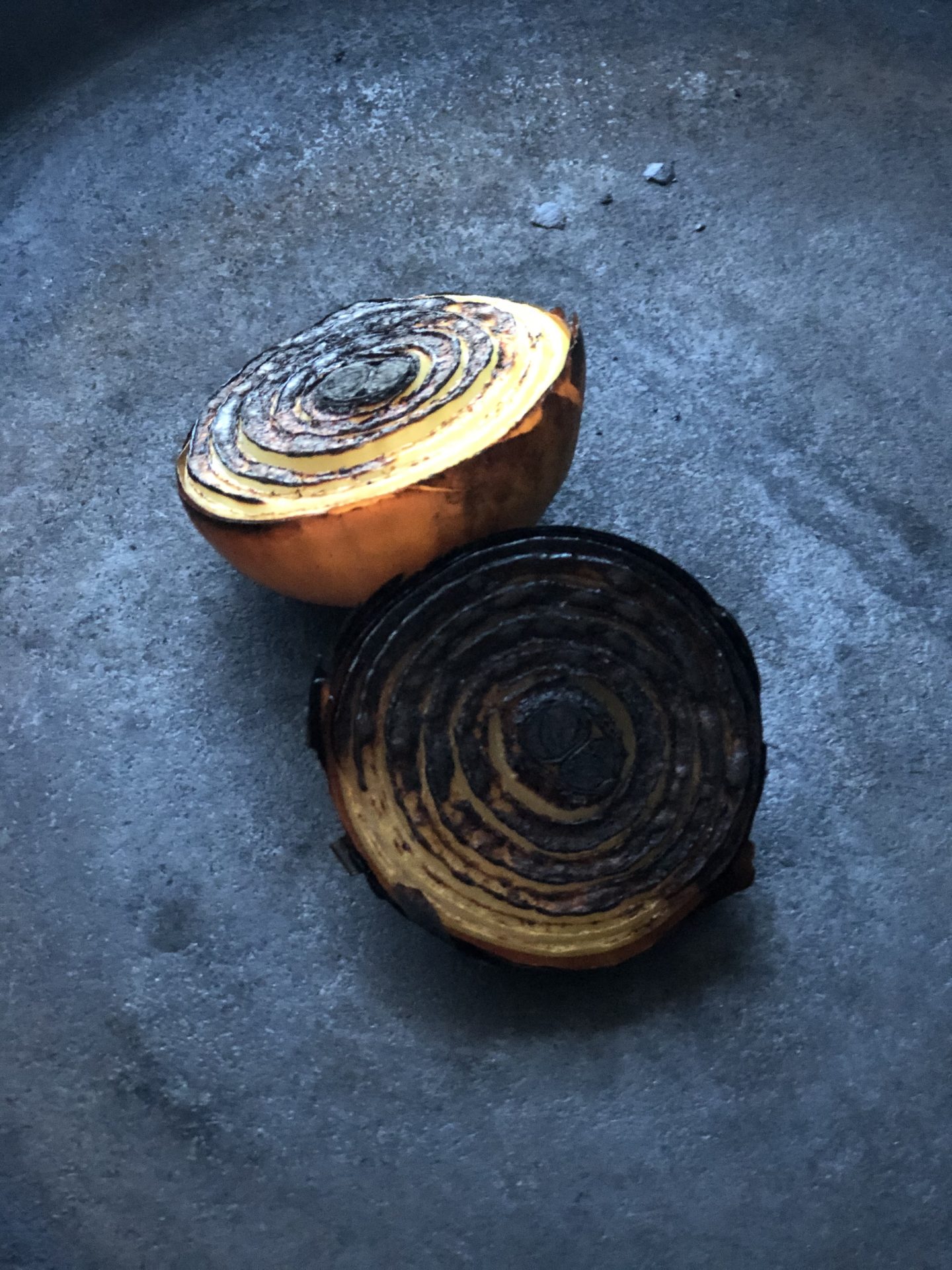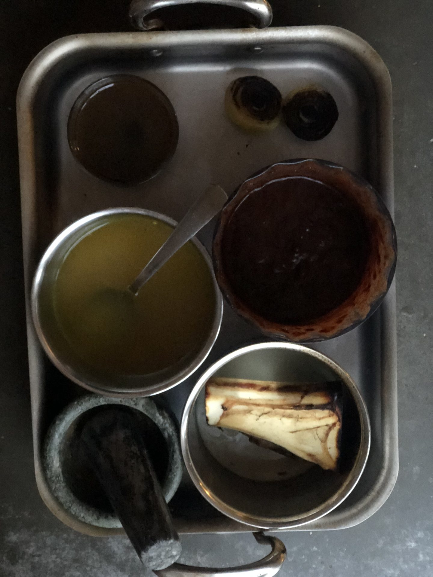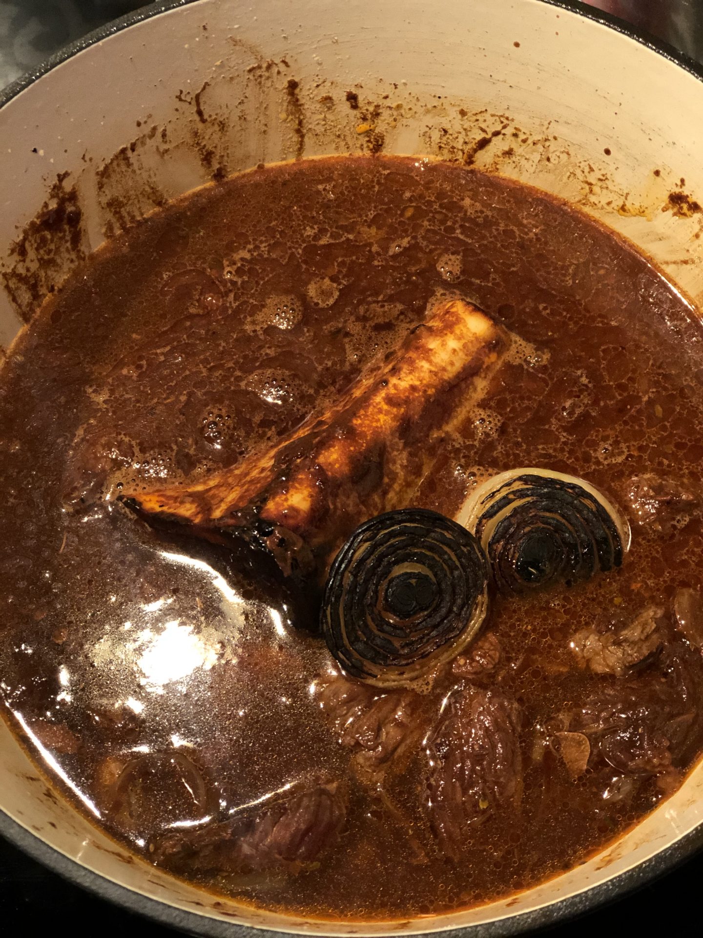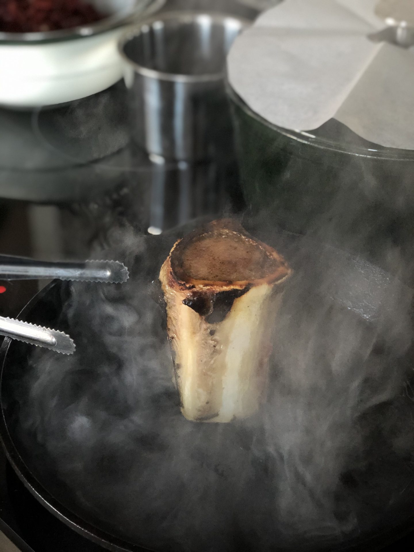 I med den rostade benmärgen och brända löken.