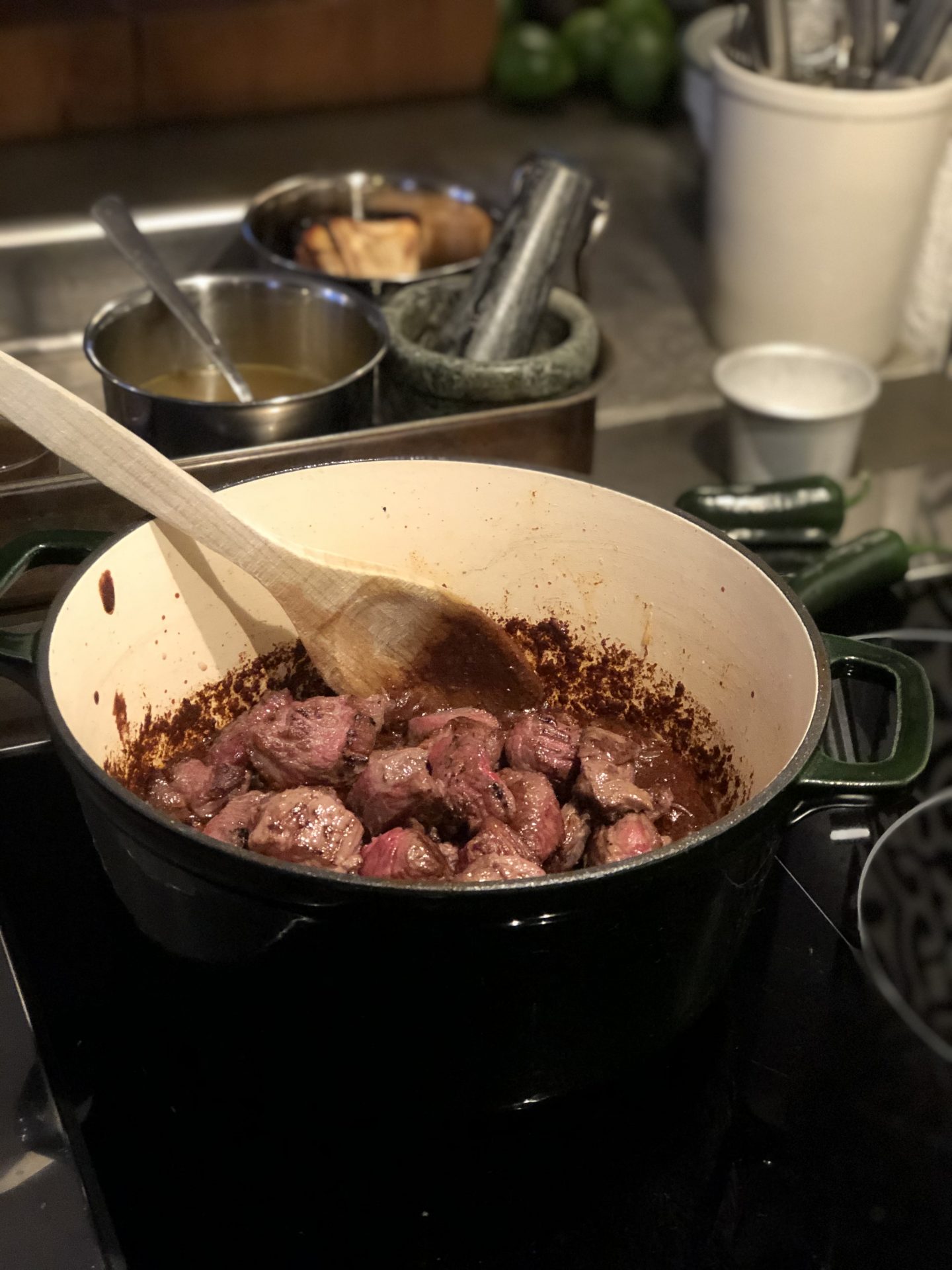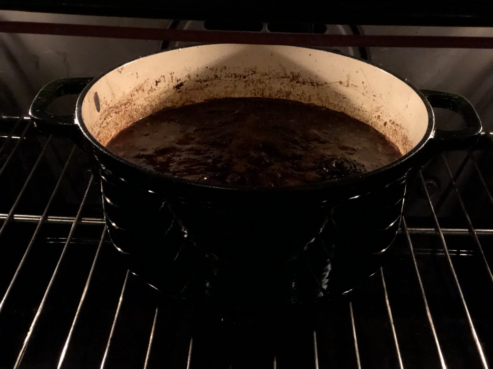Ställ sedan gjutjärnsgrytan (denna snygga gröna gryta kommer från Cervera, ni hittar den här) i ugnen på 160 grader i cirka 3 timmar eller tills köttet faller isär av sig självt när man petar på det med en gaffel.