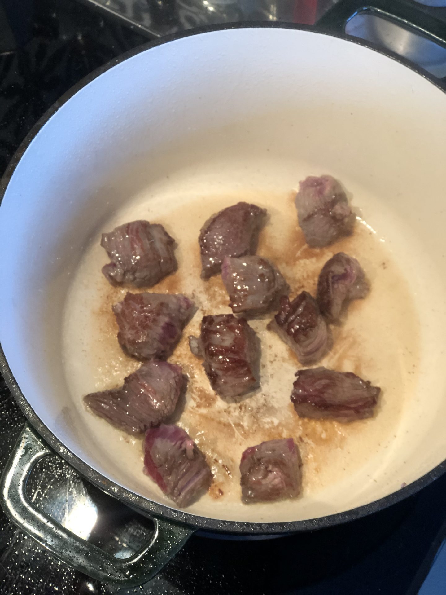 Bryn köttet snabbt runtom i en het gjutjärnsgryta.