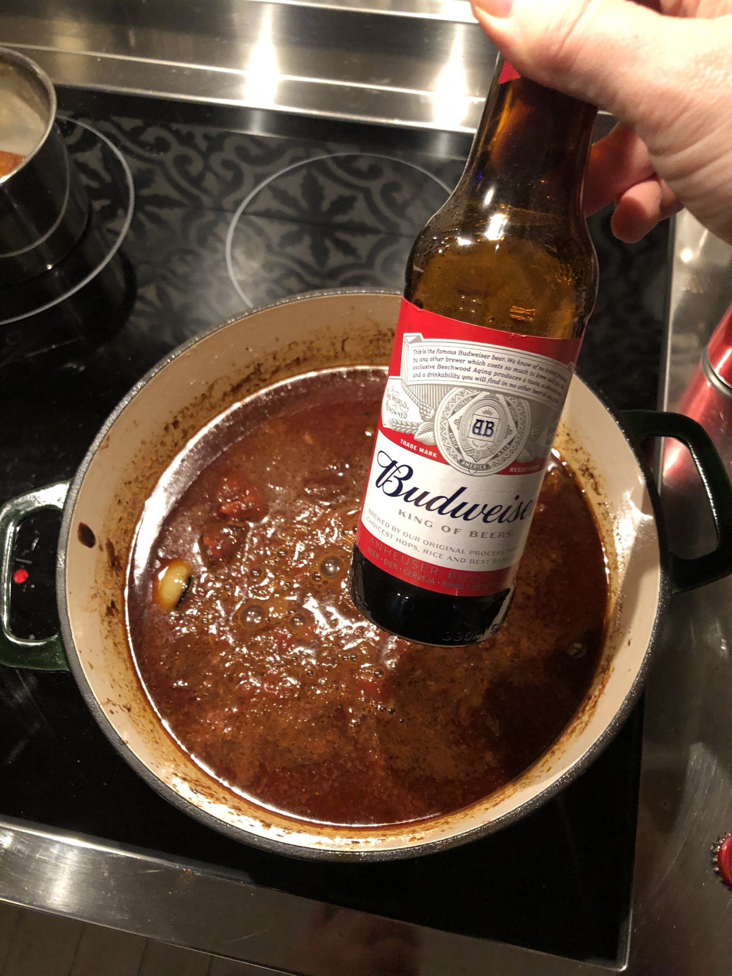 Sen en halv flaska eller burk öl och sedan kyckling buljongen.