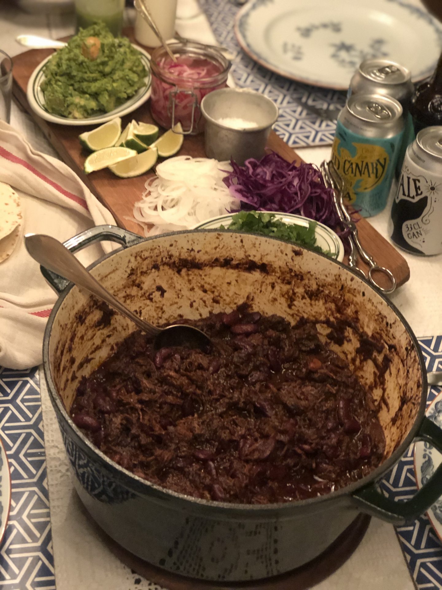 Använd två gafflar för att dra isär köttbitarna i strimlor. Rör om och servera med t ex tortilla, guacamole, inlagd rödlök, strimlad rödkål, koriander, gräddfil (gärna med en liten skvätt vinäger i) och lime.
