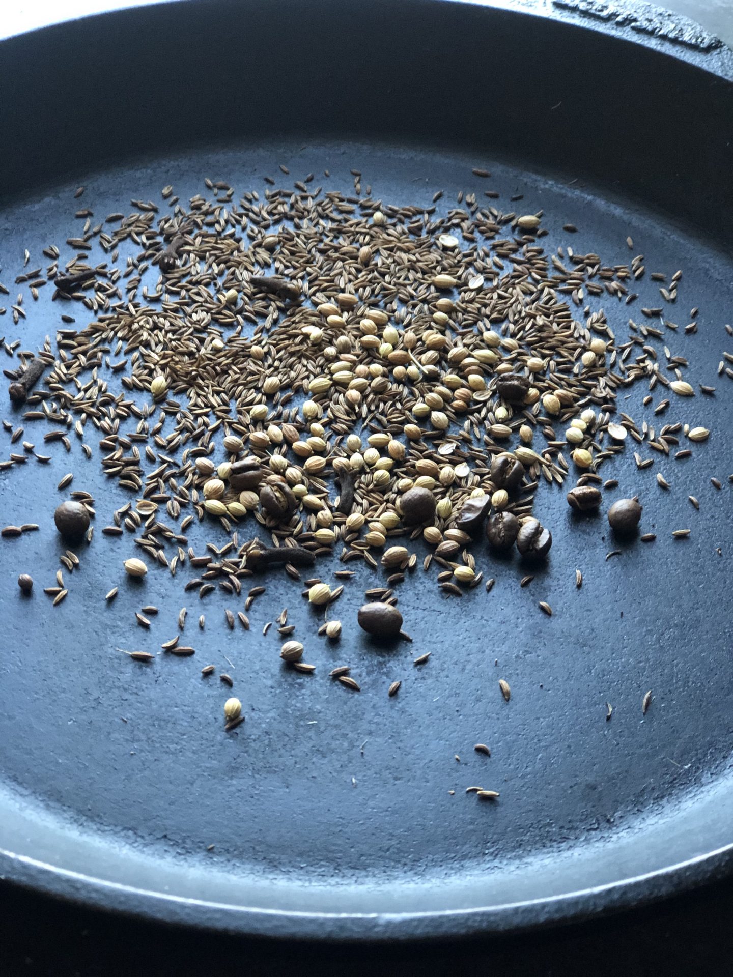 Rostad kummin, korianderfrön, kaffebönor och fyra nejlikor