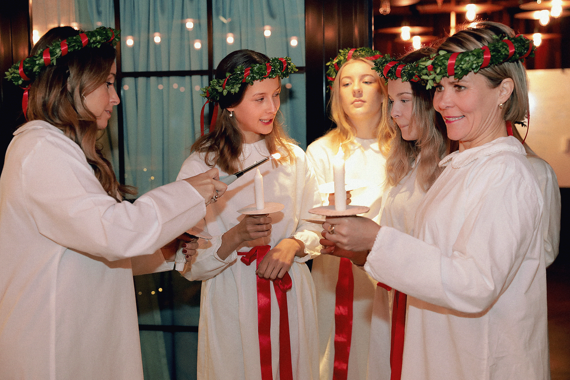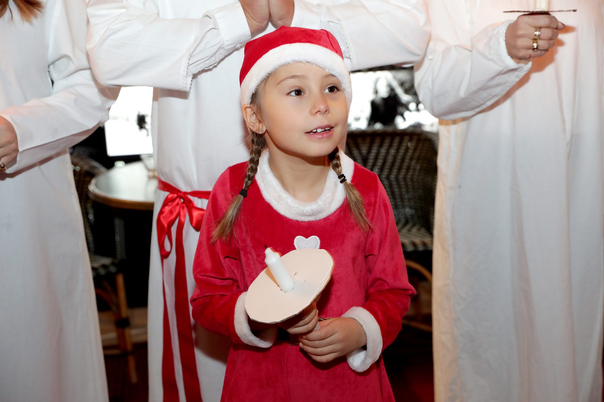 Vi sjöng några sånger och sen var det dags att ta med alla våra gäster till den dukade salen. Då gick vi i luciatåget först och alla gäster följde efter och sjöng med i luciasången.