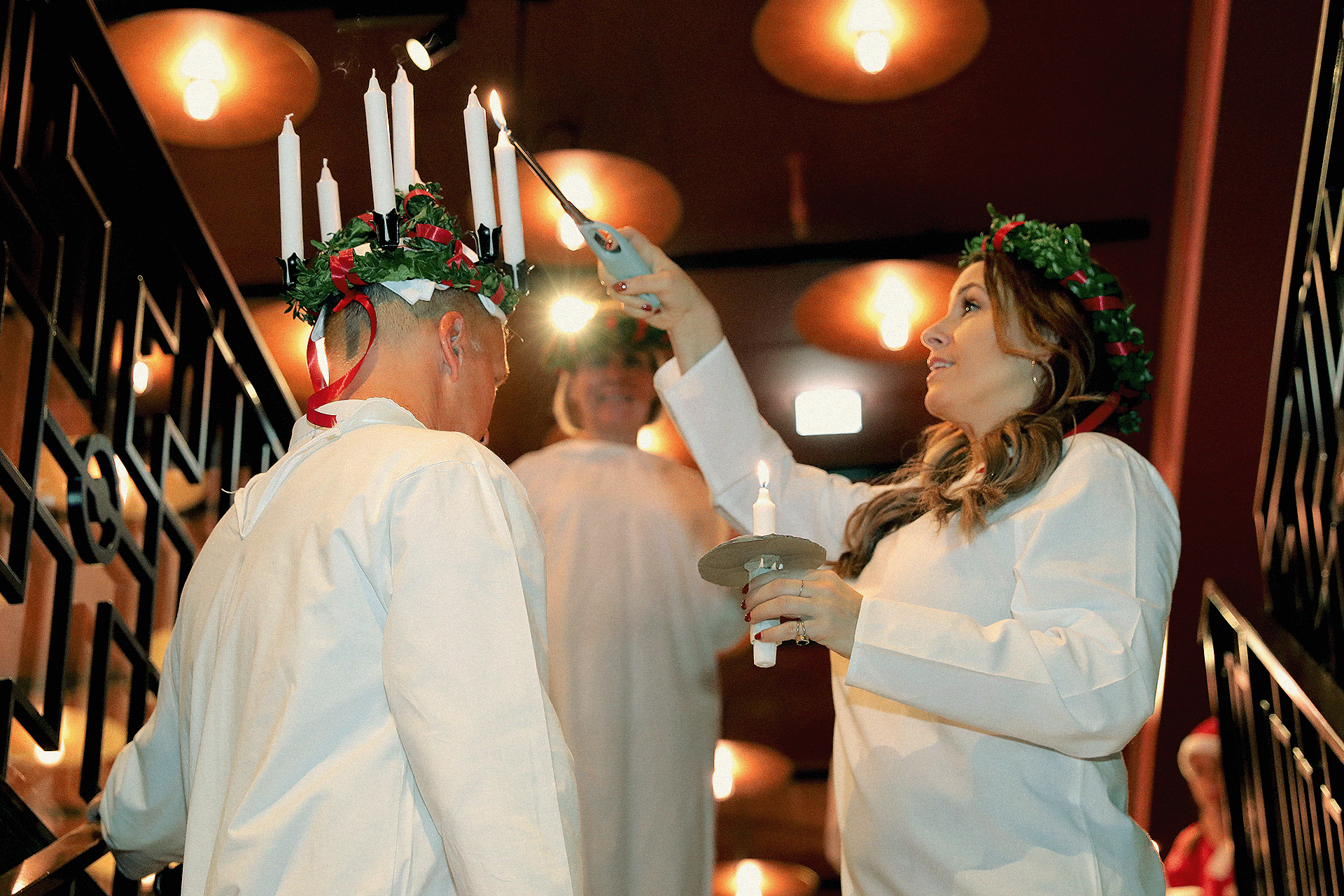 Gabriel var lucia och när alla tärnornas ljus var tända så tände jag hans krona och sen skred vi sakta ner för trapporna för att möta våra gäster med julsång.