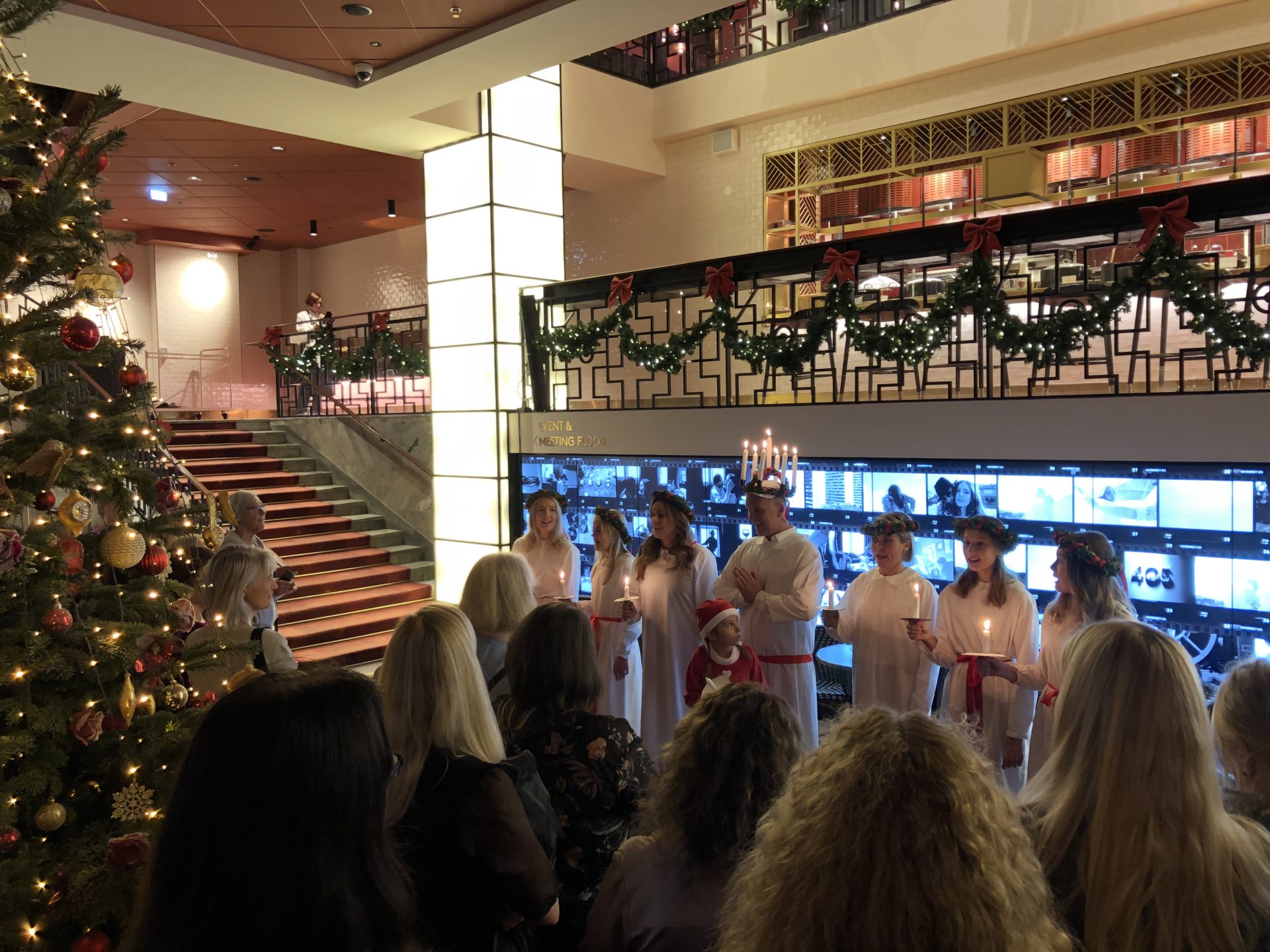 Här kommer vi ner för trapporna mot lobbyn där alla stod och drack glögg.