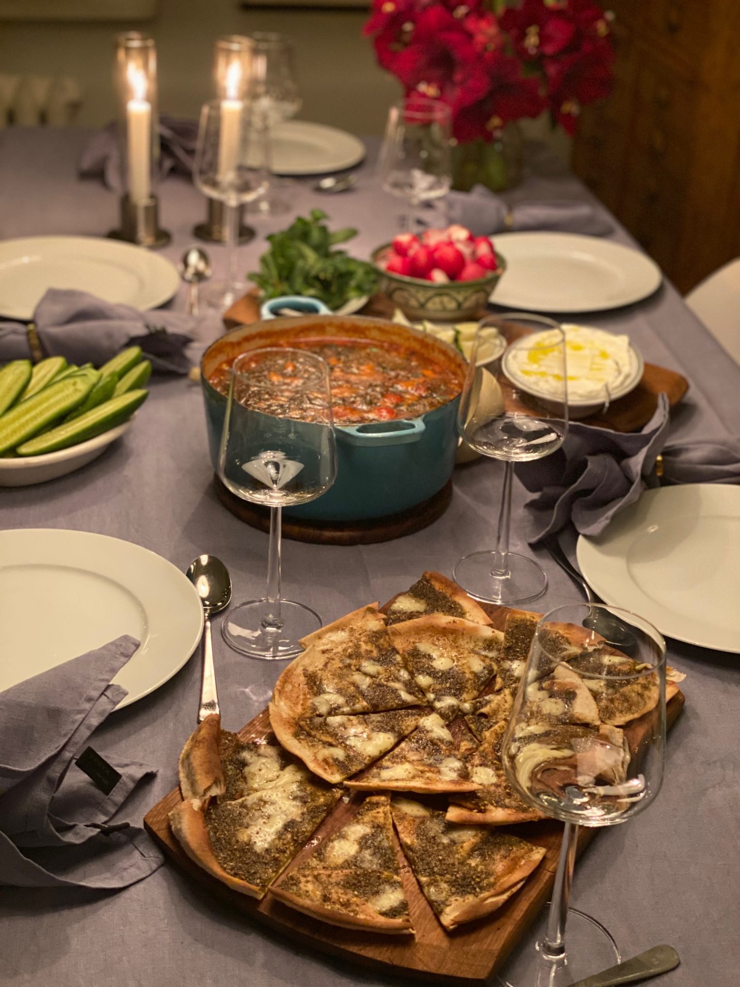 Precis innan jag ställer fram grytan med soppan på bordet garnerar jag soppan med lite zaatar, några färska myntablad och avslutar med att ringla lite olivolja över. Servera soppan med limeklyftor att pressa över, extra färsk mynta och lite yoghurt att ringla över och manakish.