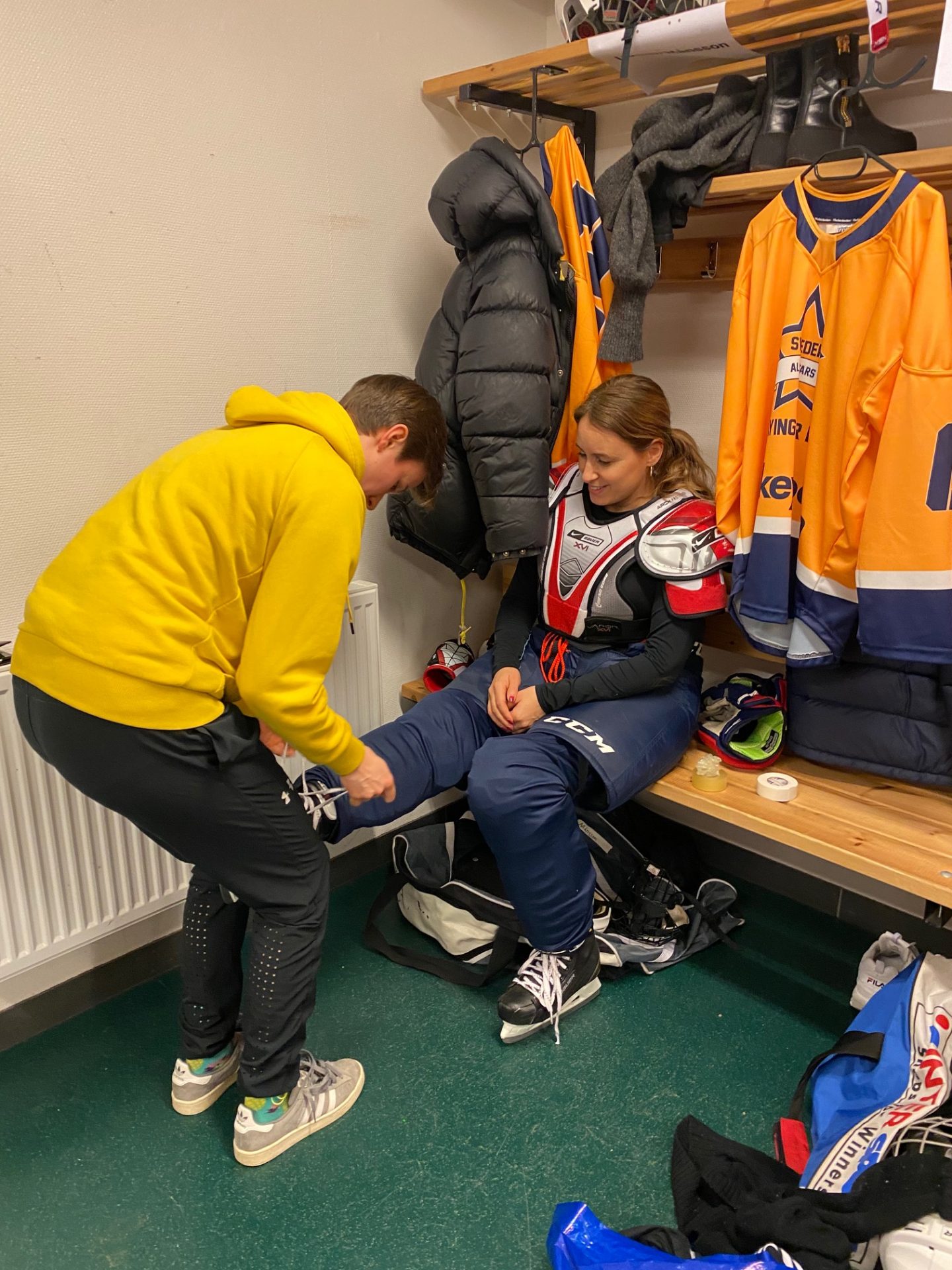 Här får jag hjälp med grillorna (så säger vi ishockeyspelare om skridskor) av Fanny Brolin.