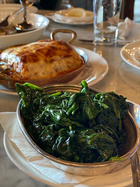 Bakom spenaten skymtar man en Melanzane alla parmigiana som är min favoriträtt inom italienska köket.