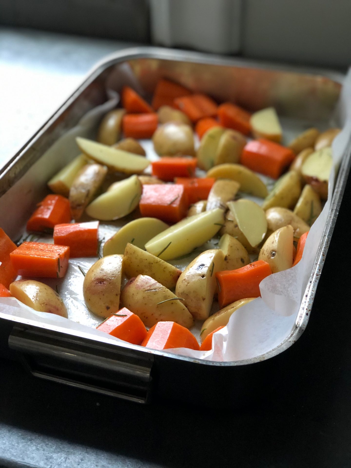 Beroende på vad du tycker blir finast; halvera/klyfta potatisen, skär rotfrukterna i större bitar, eller dela längs med.