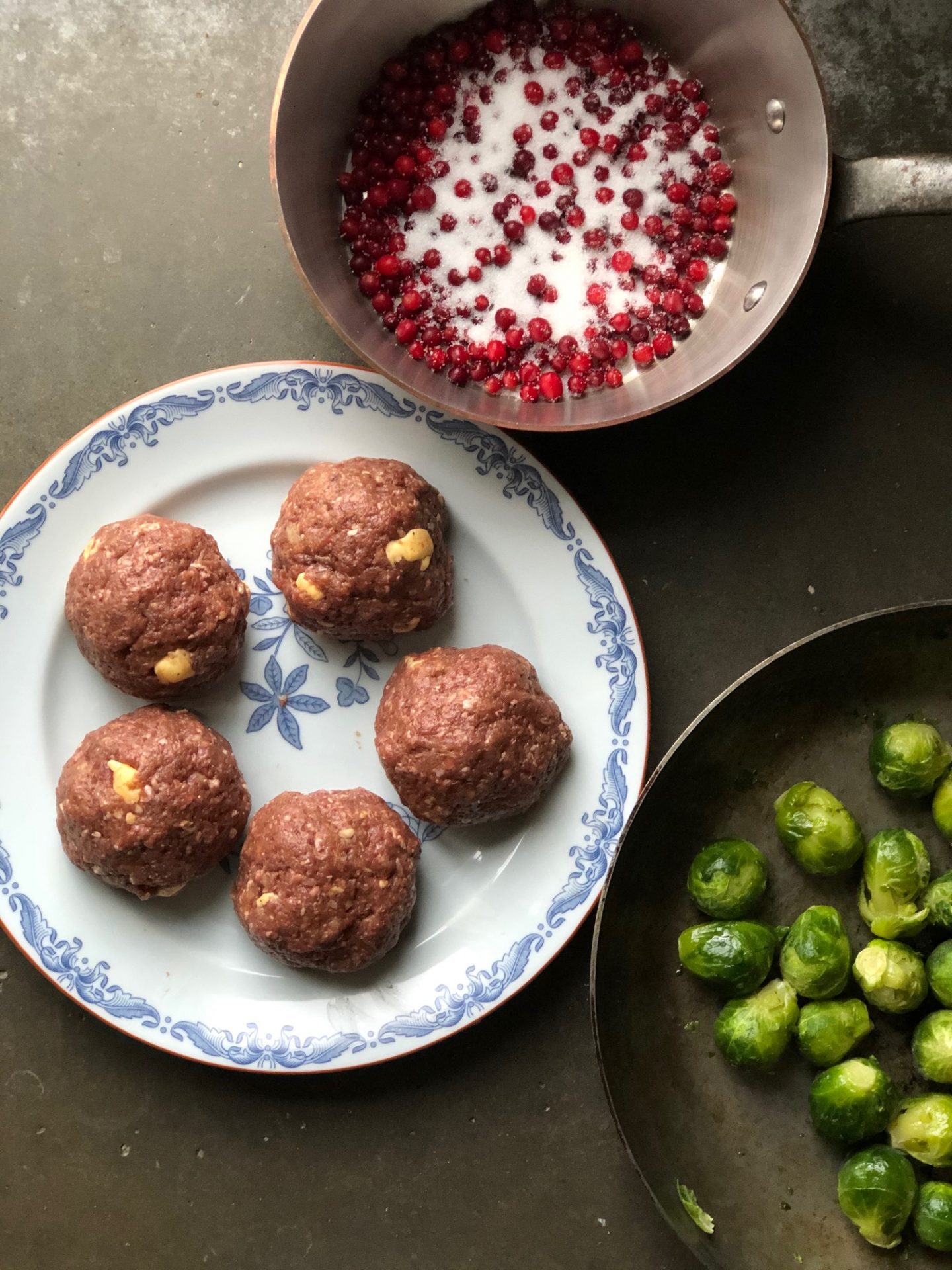 Älgfärsbiffar med med kantarellsås, ugnsbakade rotfrukter och rårörda lingon
