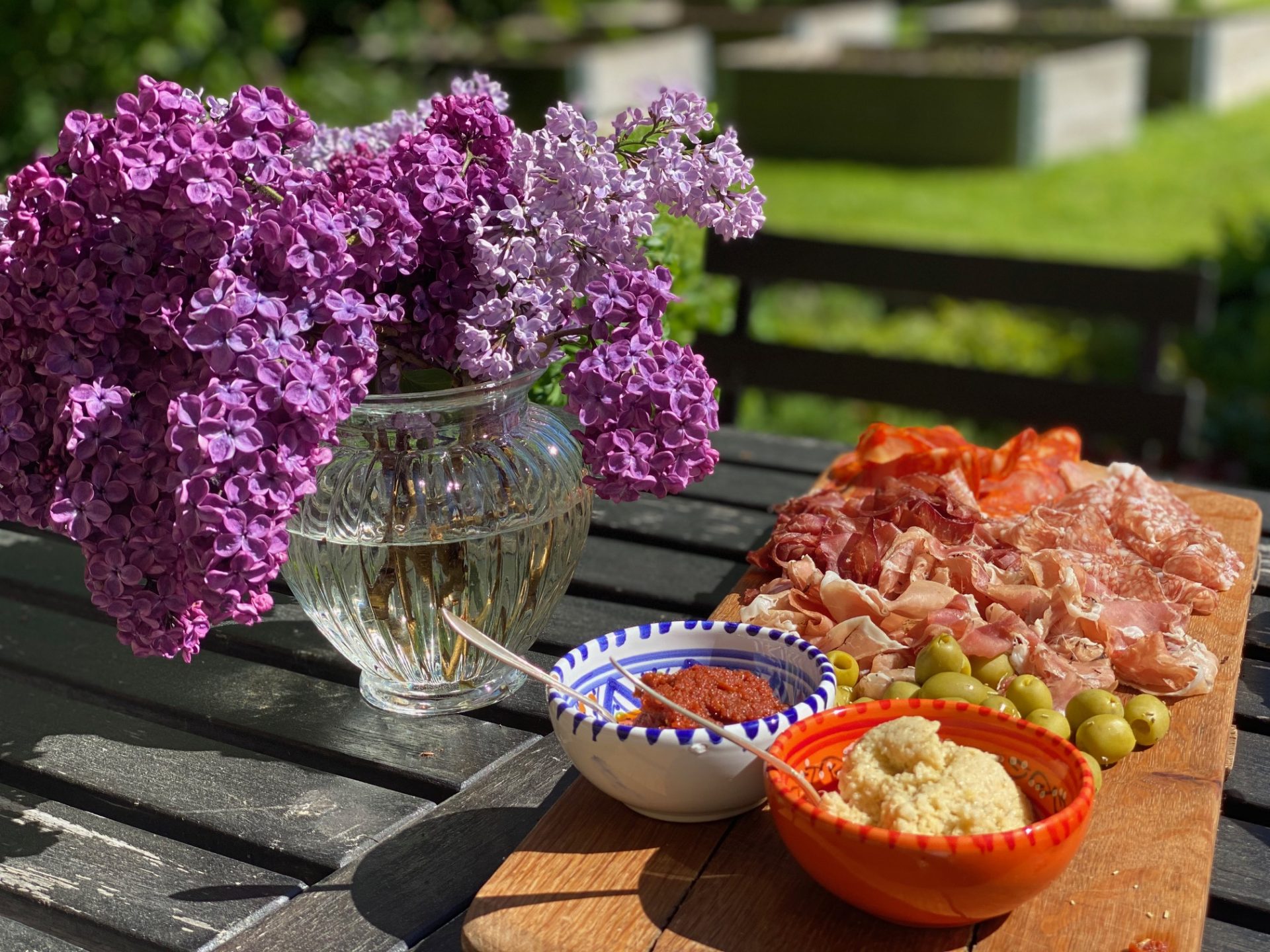 Det blev charkbricka med röd pesto och jordärtskockskräm serverades på en skärbräda från vindistriktet Constansia i Kapstaden. Vi har flera sådana som vi släpat med oss från våra resor hem från Sydafrika. Dom är gjorda av gamla vintunnor och har alltid vingårdens logga inbränt på träet.