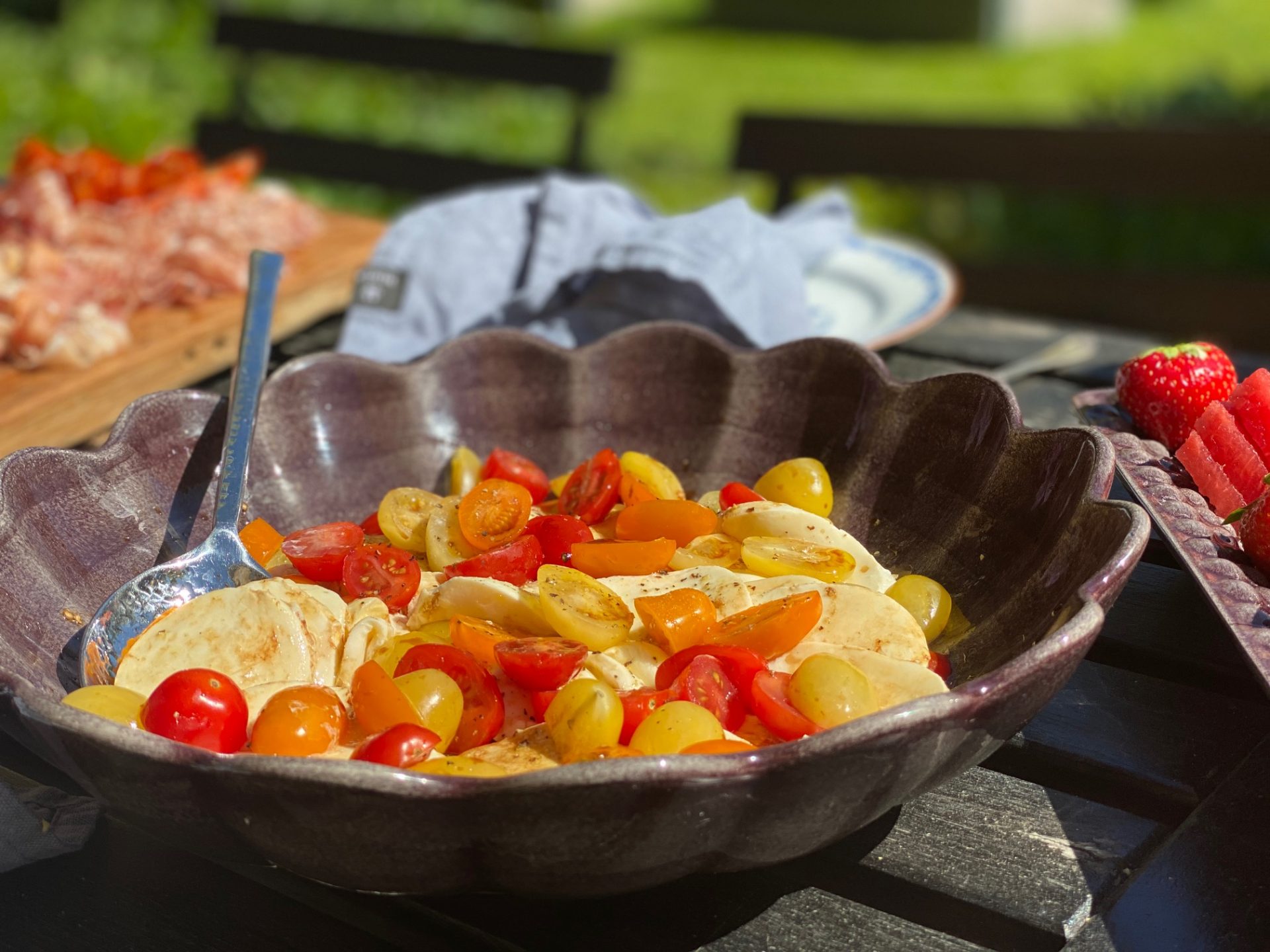 En jättegod tomat och mozarellasallad i vackert porslin från Mateus (plommonfärgat som jag älskar).