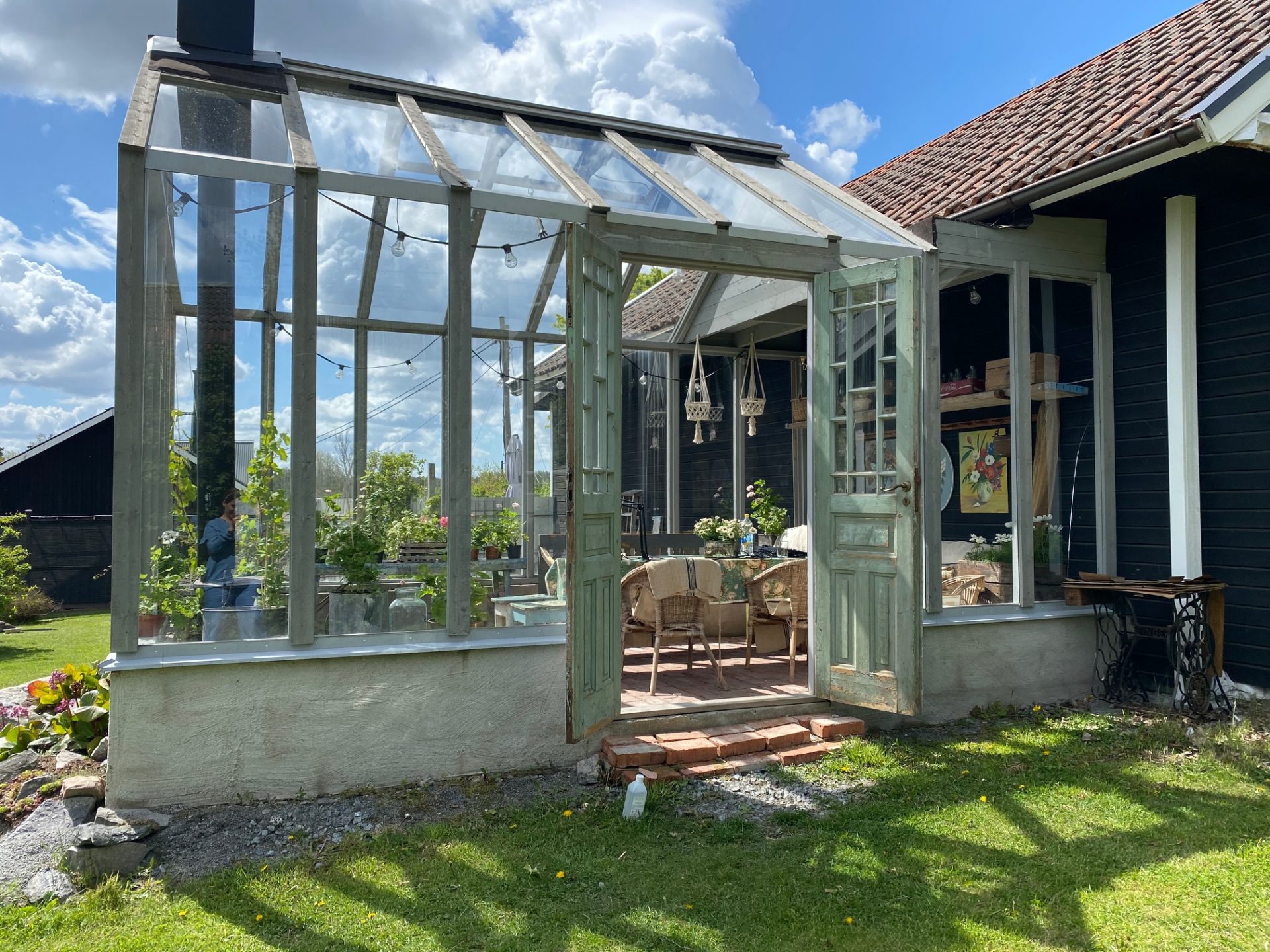 Efter den helt underbara lunchen flyttade vi in i Marlenes vackra orangeri för att sätta igång och podda.