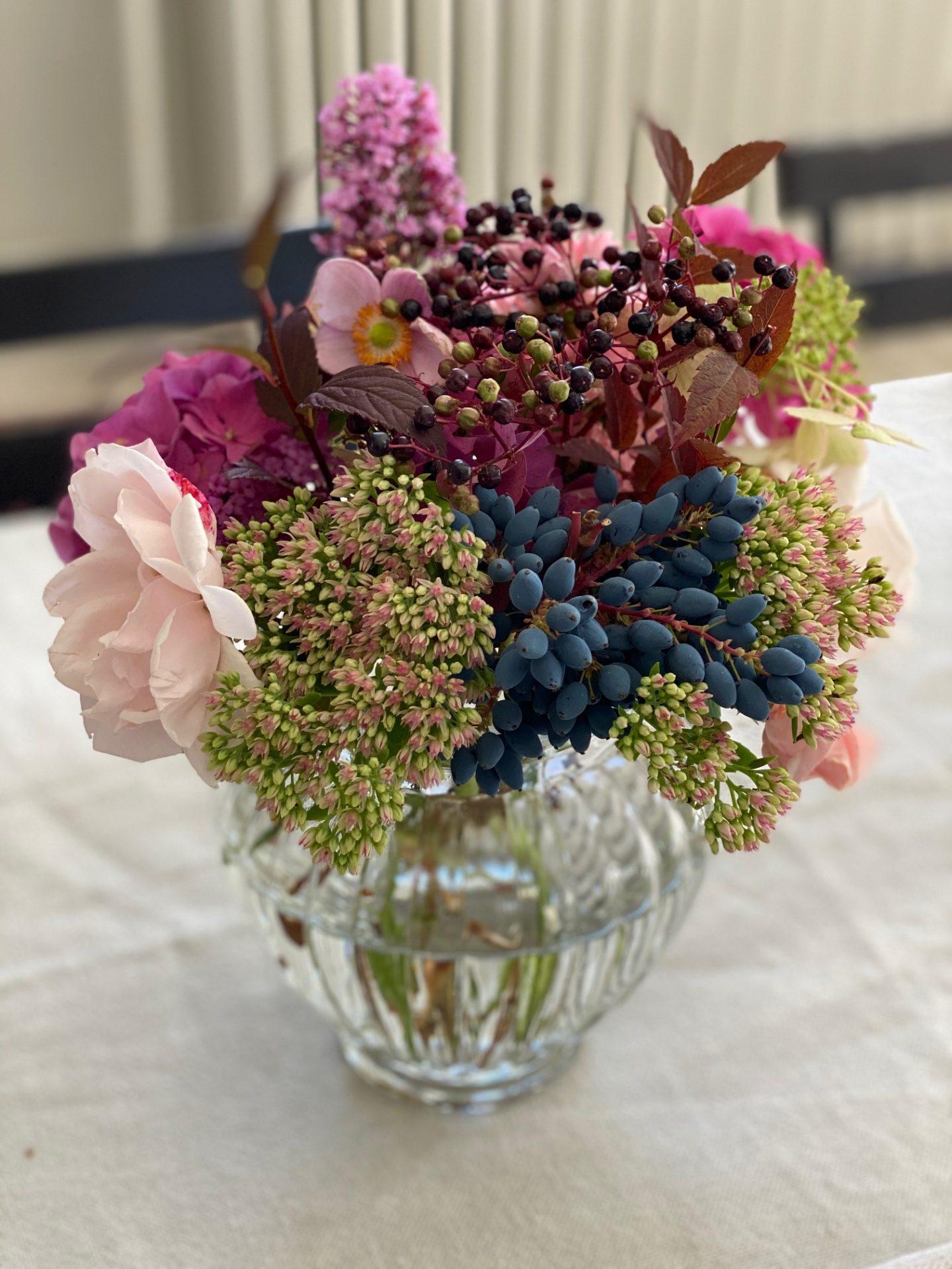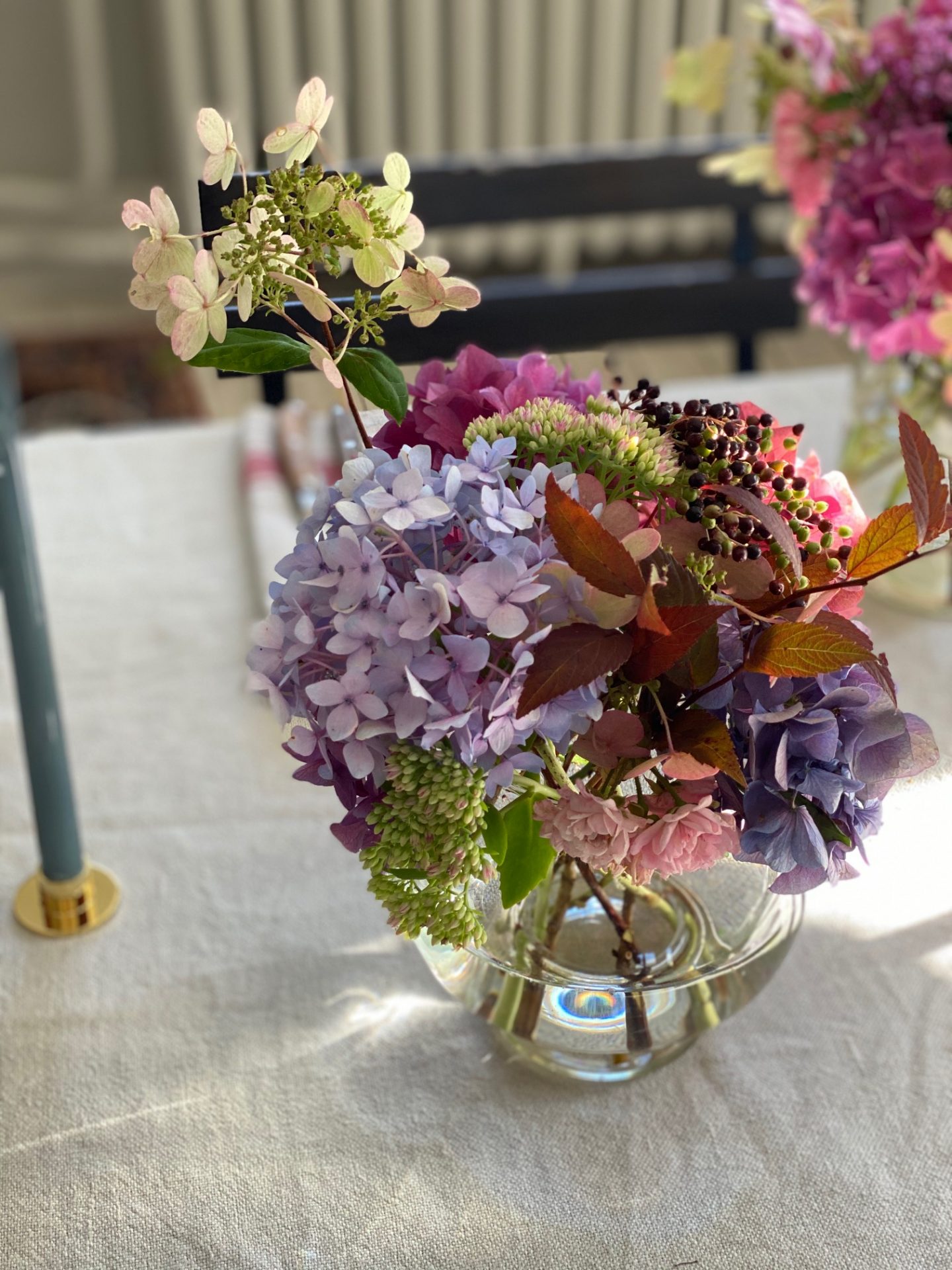 Jag har ju bara rosa och lila blommor i min trädgård så det fick bli dom färgerna i vaserna på borden.Jag letade efter rönnbär i en närliggande skog för att få in lite höstiga färger men jag hittade inga.