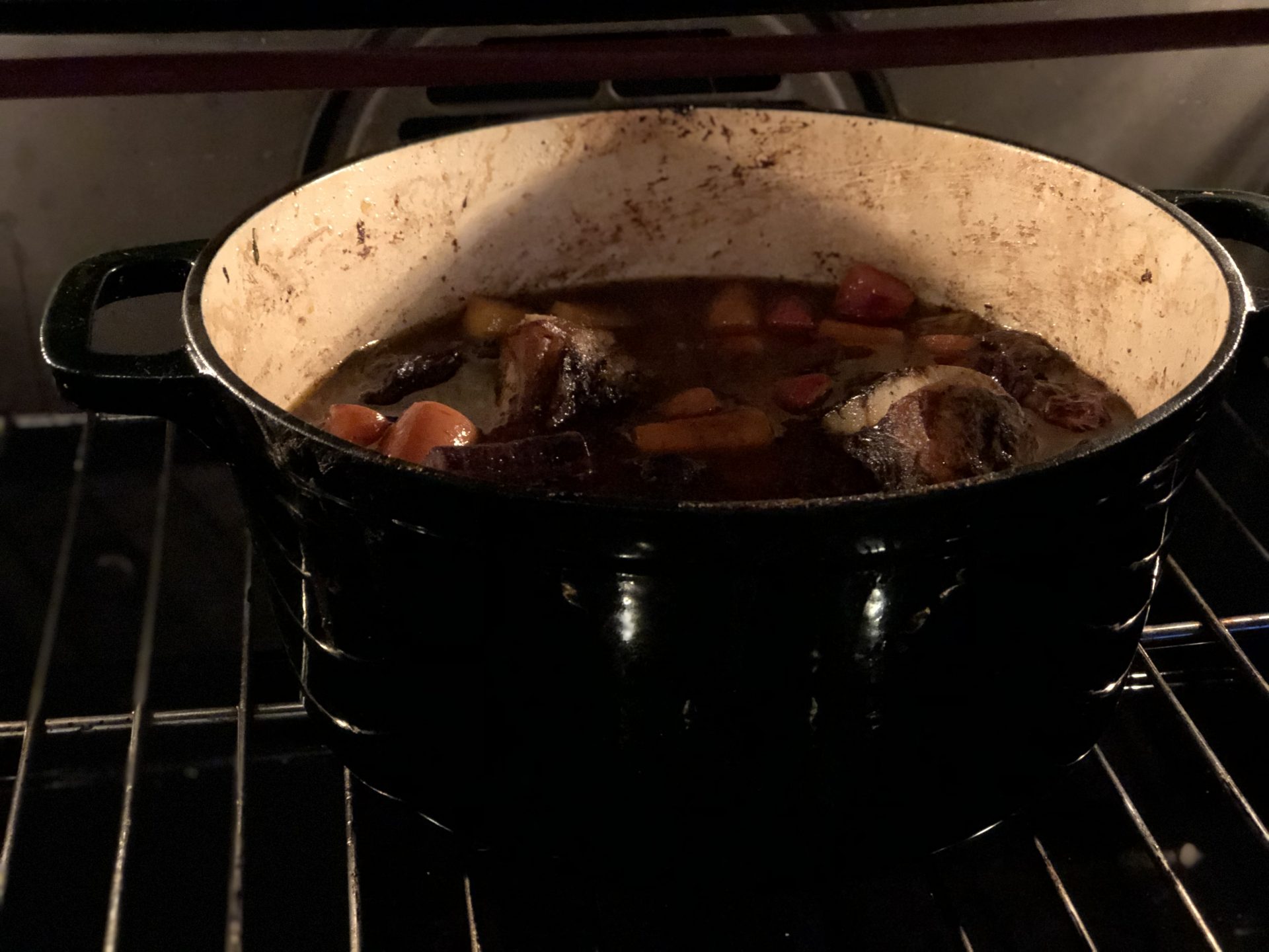 När grytan kokat upp är det dags att flytta den till ugnen. Ställ grytan utan lock på ett ugnsgaller och låt den puttra i lugn och ro i ca 1,5 h.