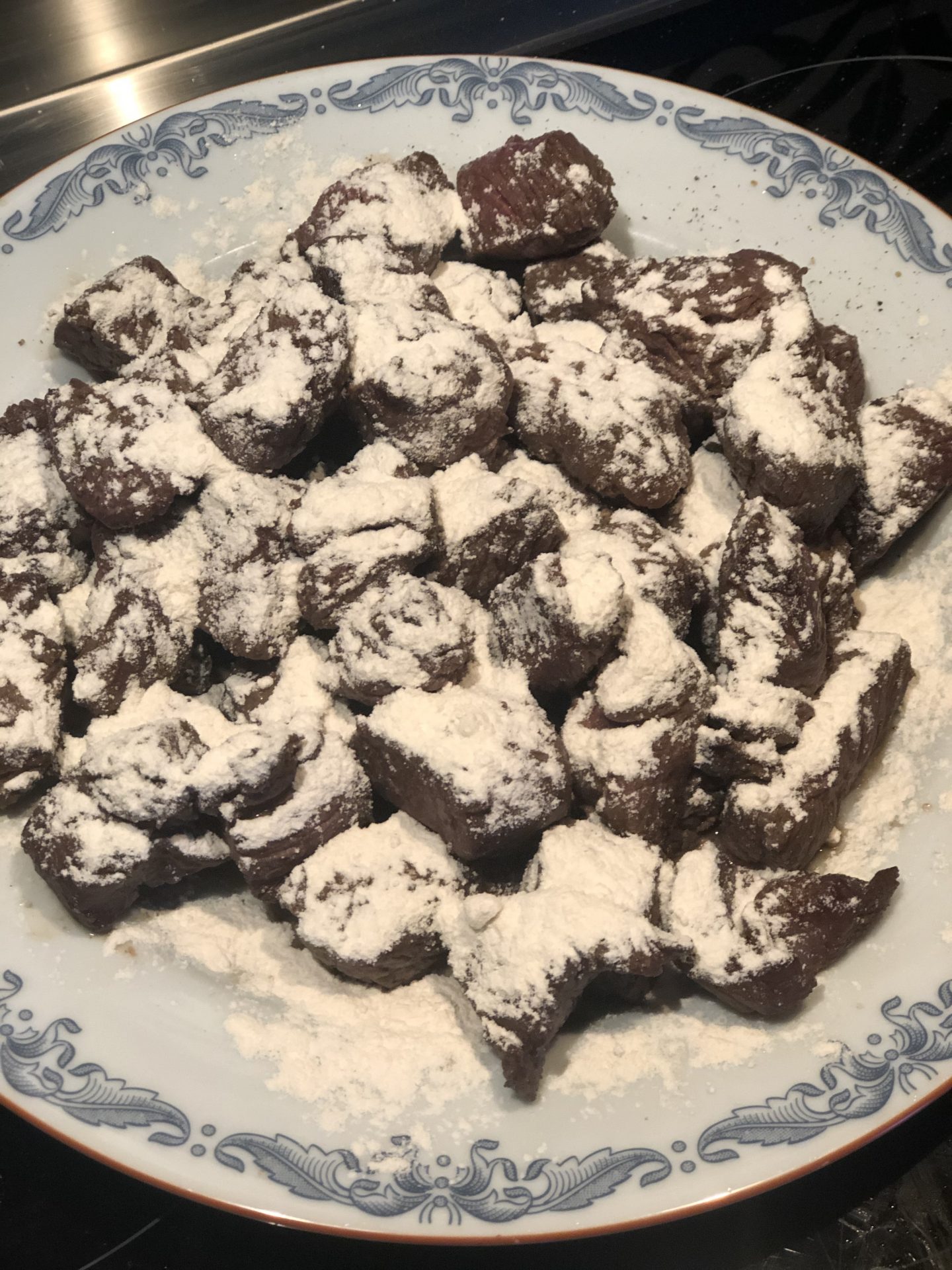 Den här gången stödde jag mjölet direkt över köttet innan jag stjälpte ner det i grytan. Annars brukar jag strö mjölet över köttet i grytan.