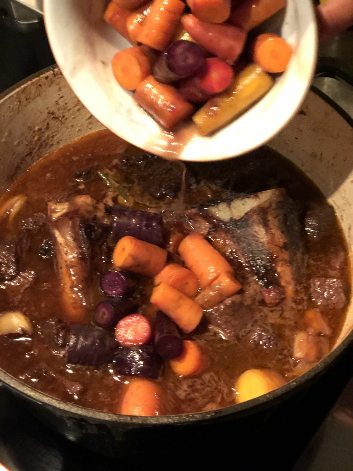 De sauterade morötterna och steklök-, sidfläsk- och svampblandingen vänds ner i grytan. (Glömde ta bort märgbenen först… Ta upp dem innan, som det står i receptet. Det är smidigare.)