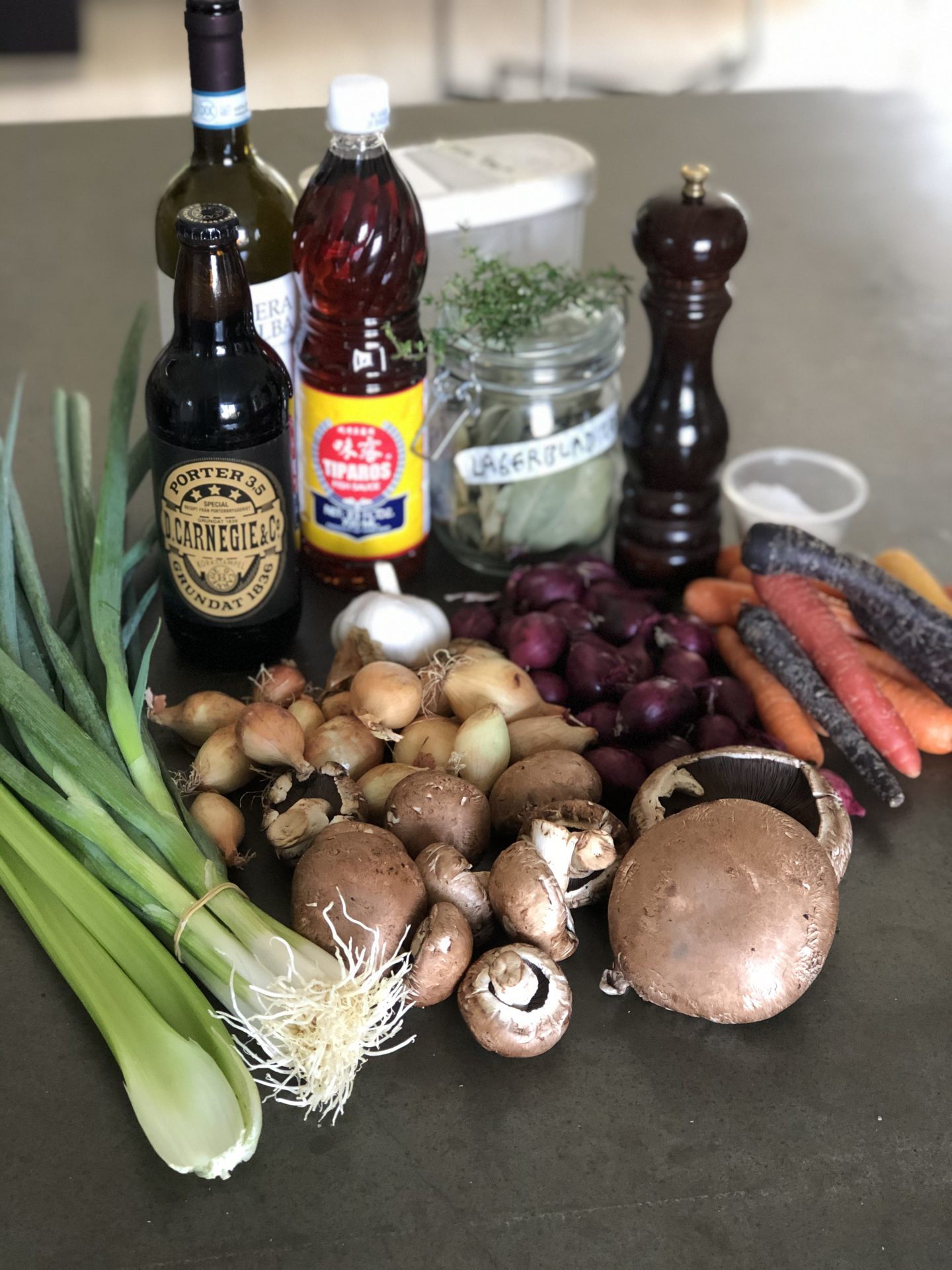 Alla dom vegetariska ingredienserna, kryddorna, vinet , porteröl och fisksås.