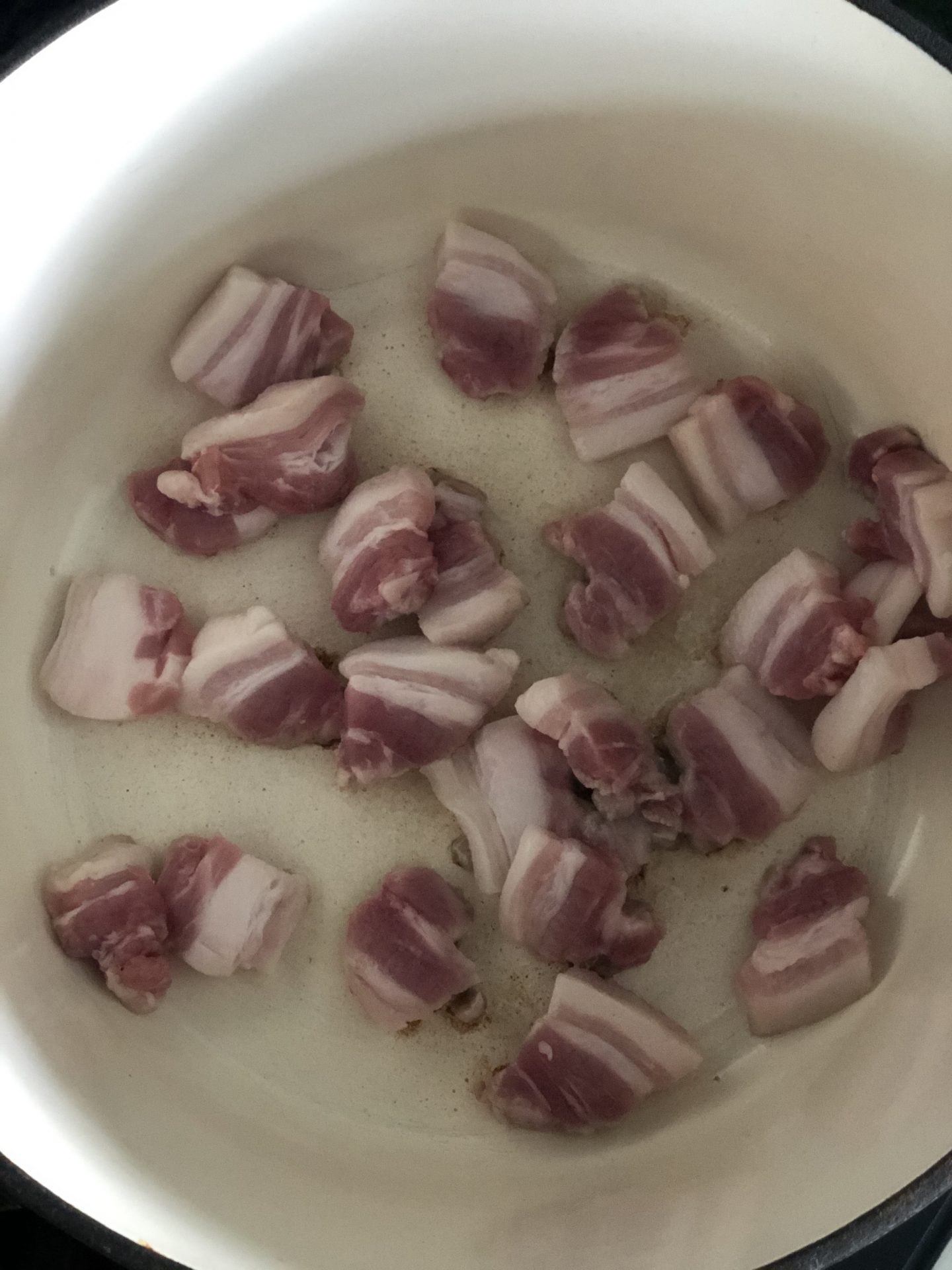 Låt sidfläsket smälta i sitt eget fett (älskar inte fläsk på något sätt men det ger en bra smak till grytan).