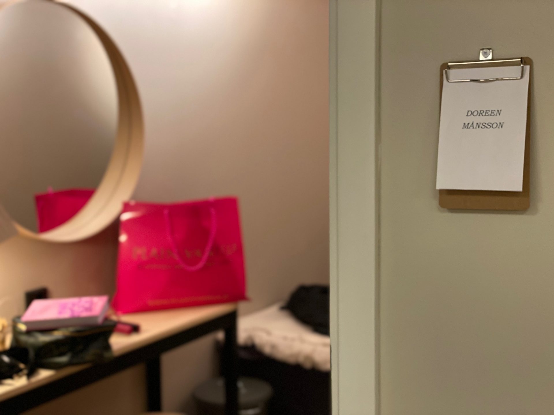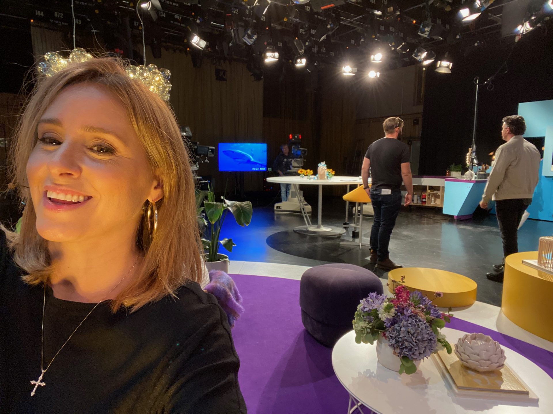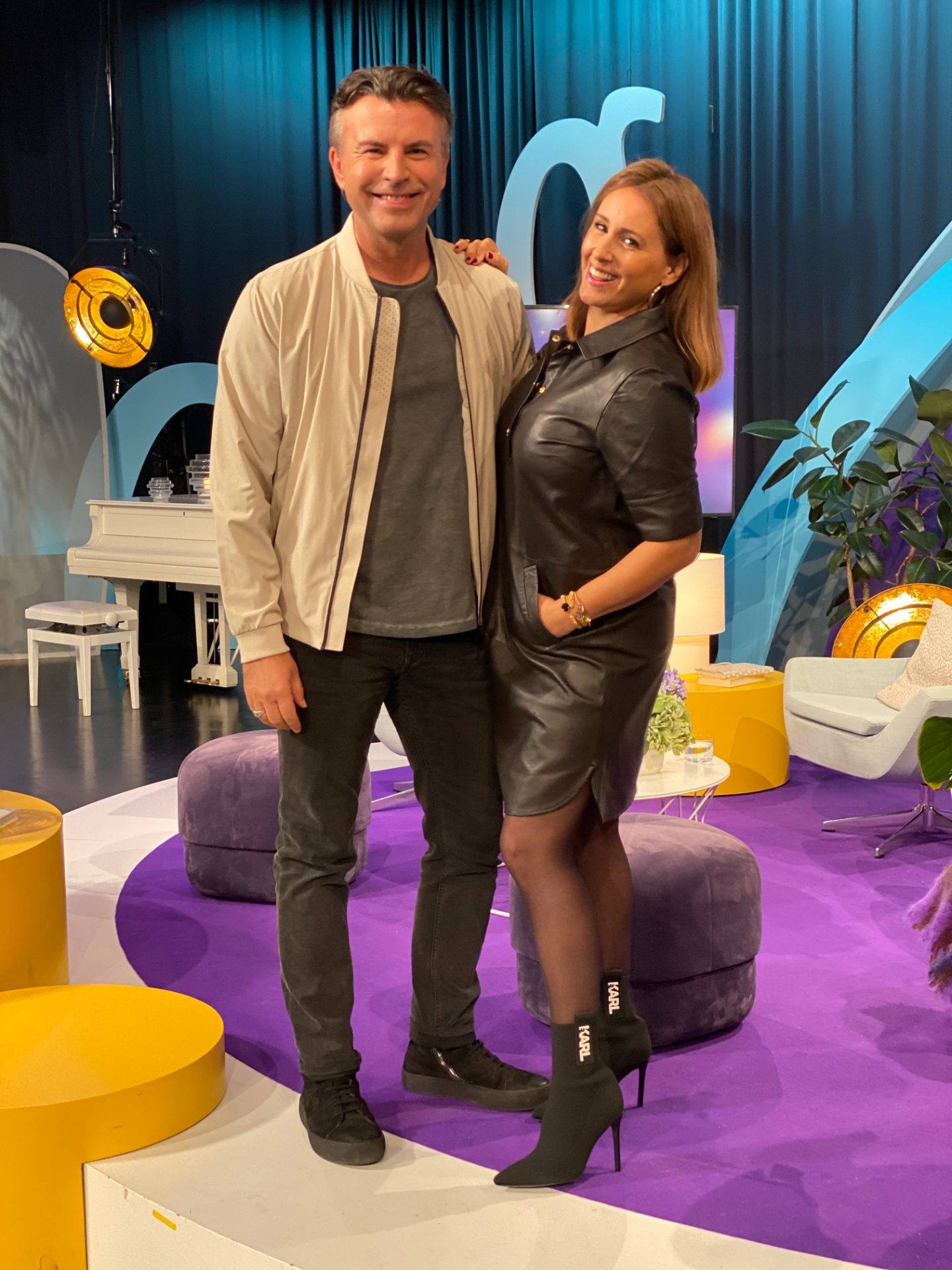 Skorna har så hög klack så jag var tvungen att öva i logen en stund innan för att inte rasa framstupa på stuiogolvet i direktsändning.