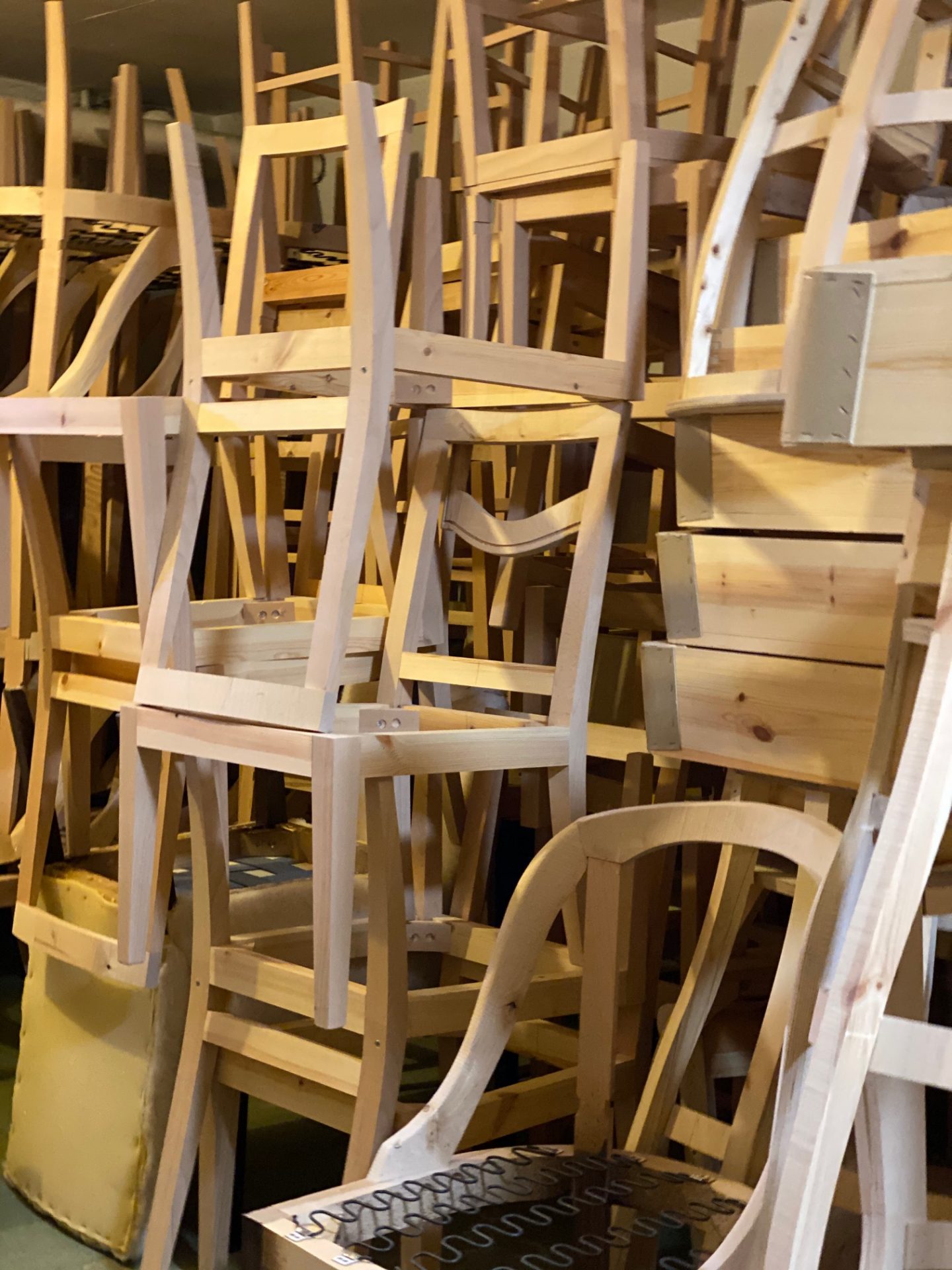 Överallt i fabriken står en massa supertunga trästommar som sen ska bli vackra och mjuka exklusiva möbler.