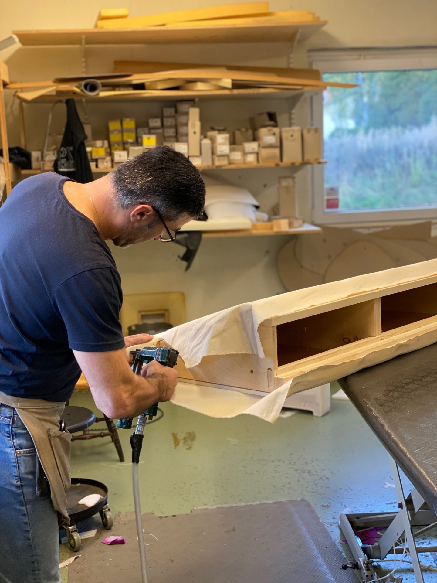 Här ser du hur min soffa kläs med vadd och tyg på trästommen av proffset Petrus. Det är pilligare än man kan ana.