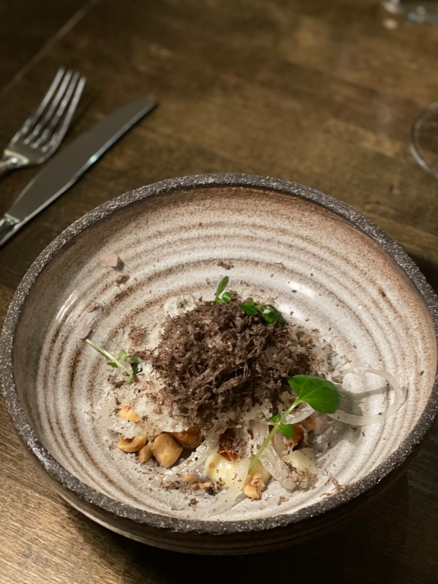 Rätt nummer två var min absoluta favorit och dom smakerna var helt insane. Bilden gör inte upplevelsen rättvisa. Det var en krispig jordärtskocka med en helt underbar hassellnötsemulsion, tryffelpecorino och isad silverlök. INSANE!!!!