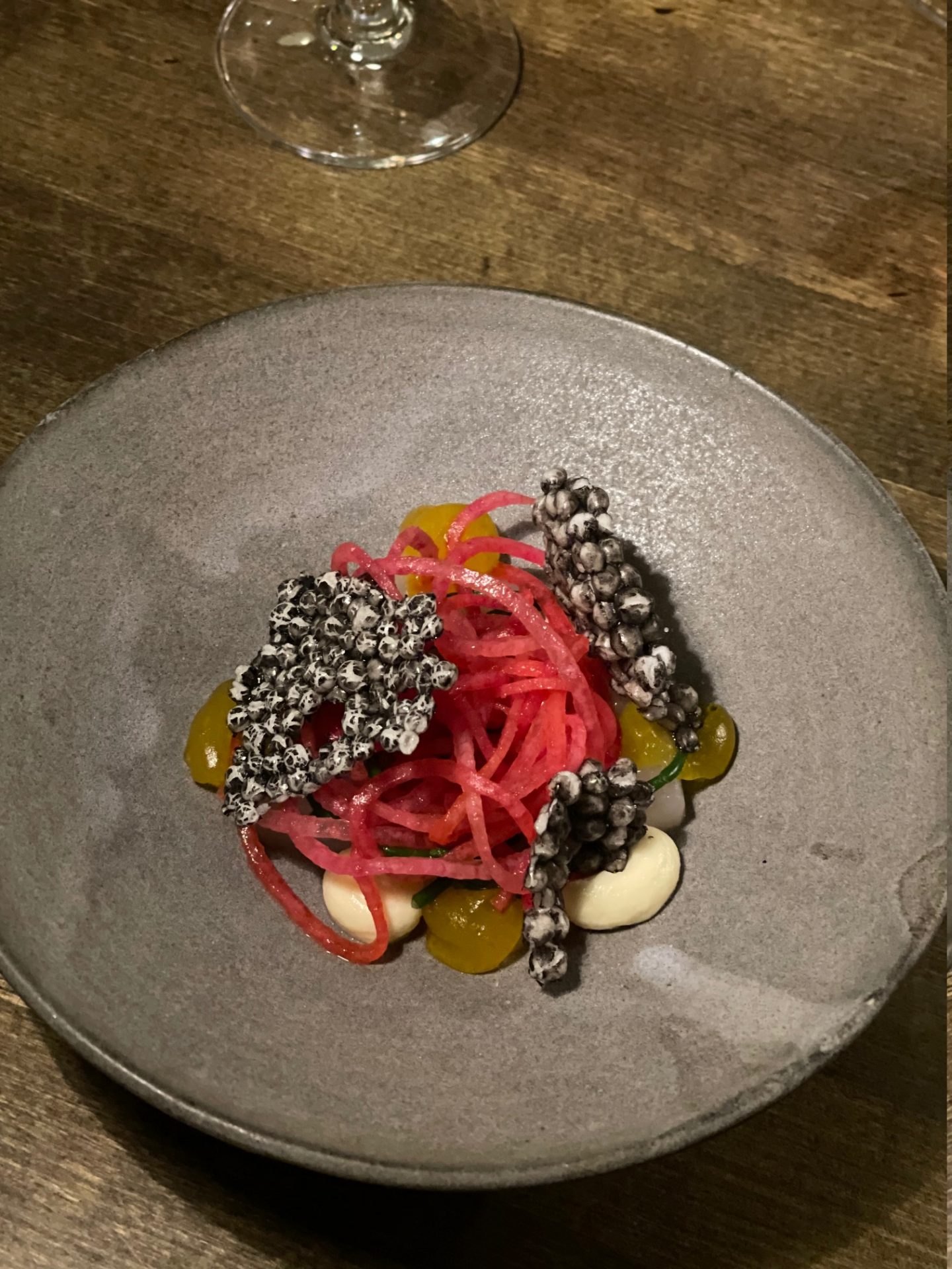Det började med en marinerad kammussla med pepparrot, rättika, Kalamansvinäger och krispiga tapiokapärlorflarn. Smakerna var helt ljuvliga tillsammans och ingen kombination jag tidigare testat. Både upplägg och smakerna är så noggrant framarbetade, det både smakar och syns.