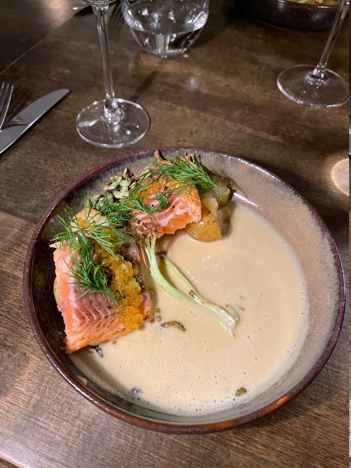Varmrätten var också helt otrolig, hade jag vågat så hade jag bett om såsen i en hink eller nåt större kärl så att jag kunde typ få bada i den. Det blev en sotad röding med fiorina, musli, rödingrom och rökt smörsås. Fisken var helt perfekt tillagad. Den rökta smörsåsen var som sagt inte klok ihop med rödingen.