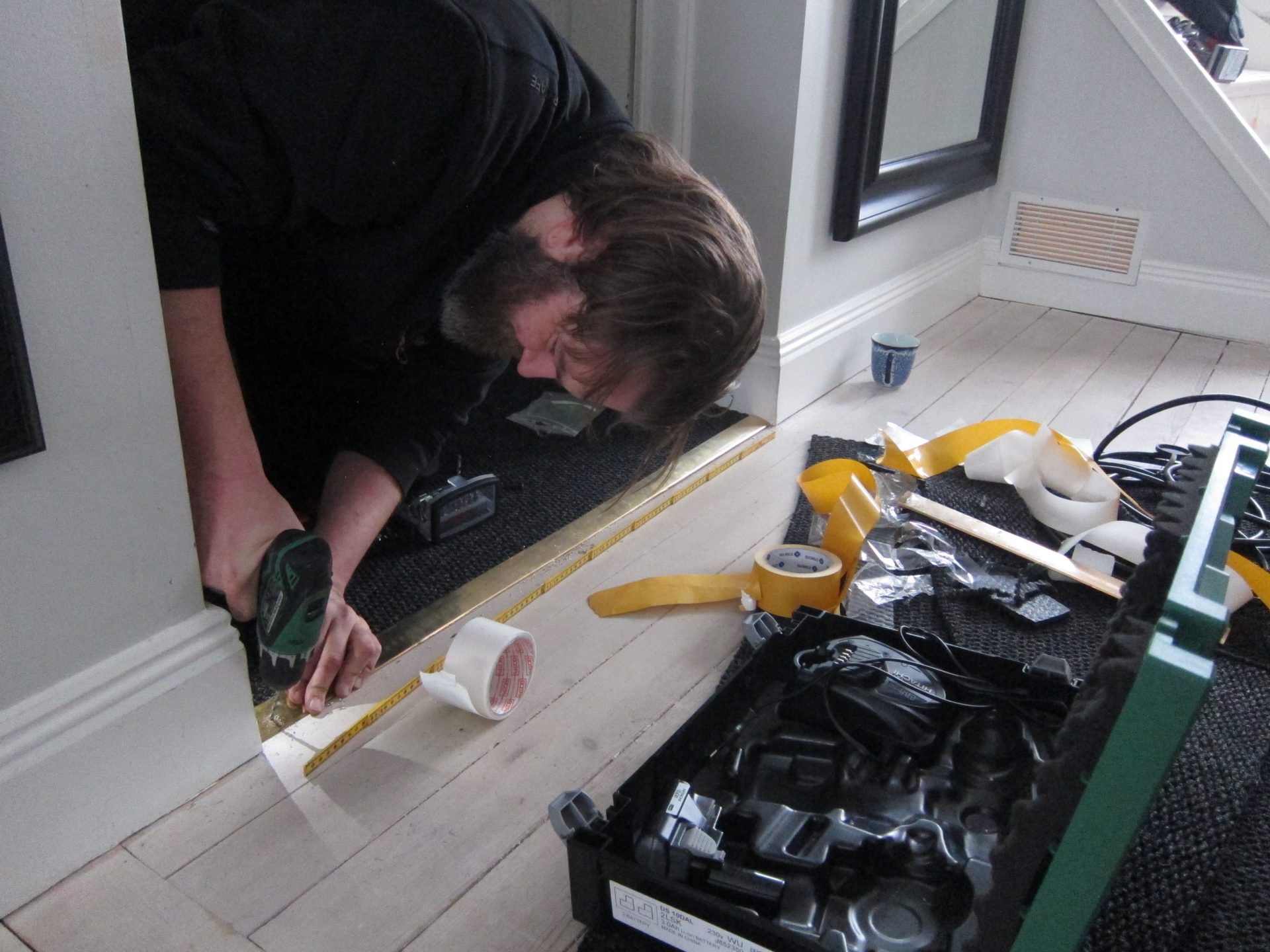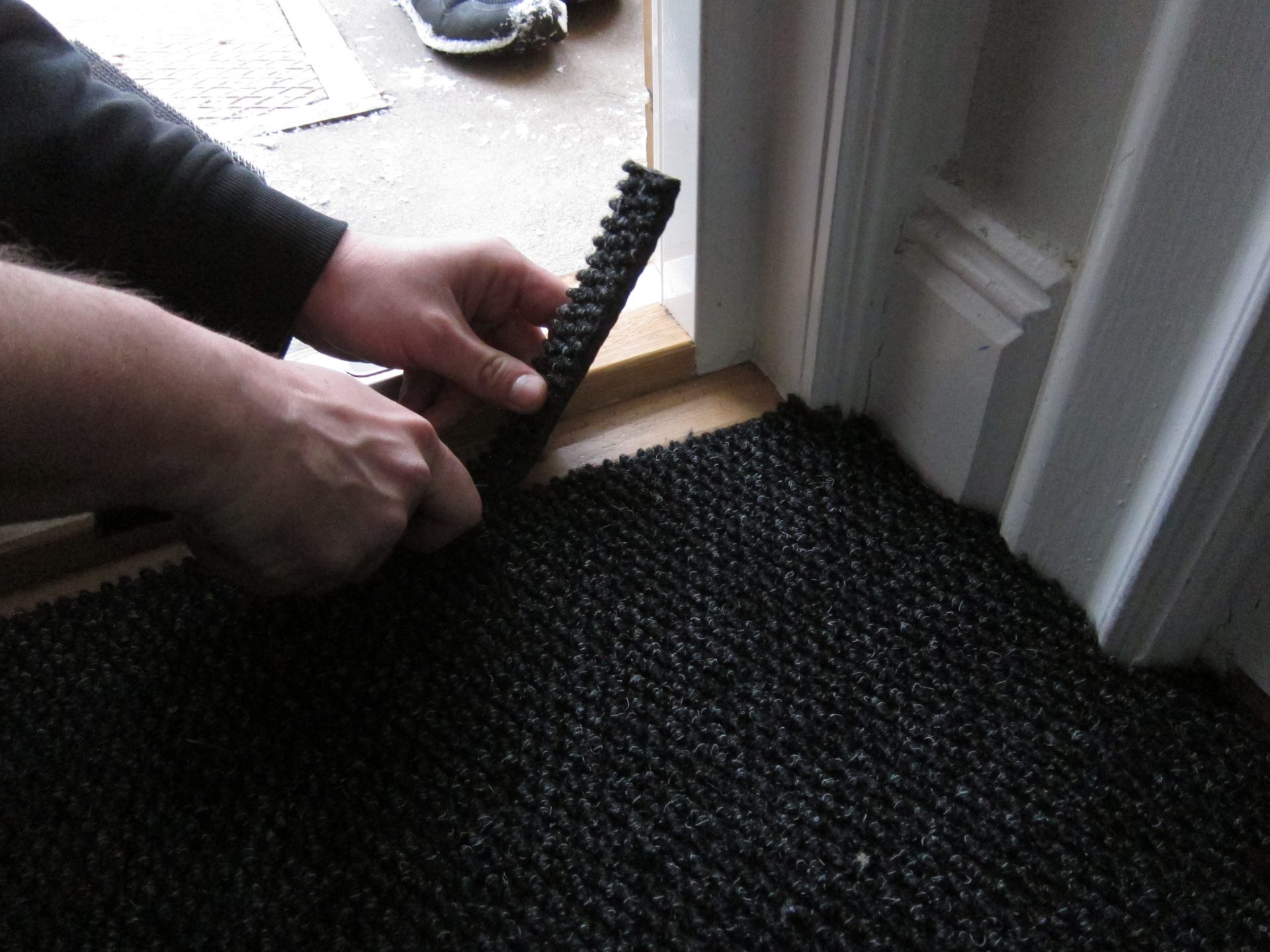 Carl-Johan kom med en stor bit av min hallmatta och beskar den på plats så att den skulle passa perfekt mellan dom olika socklarna och tröskeln mot ytterdörren.