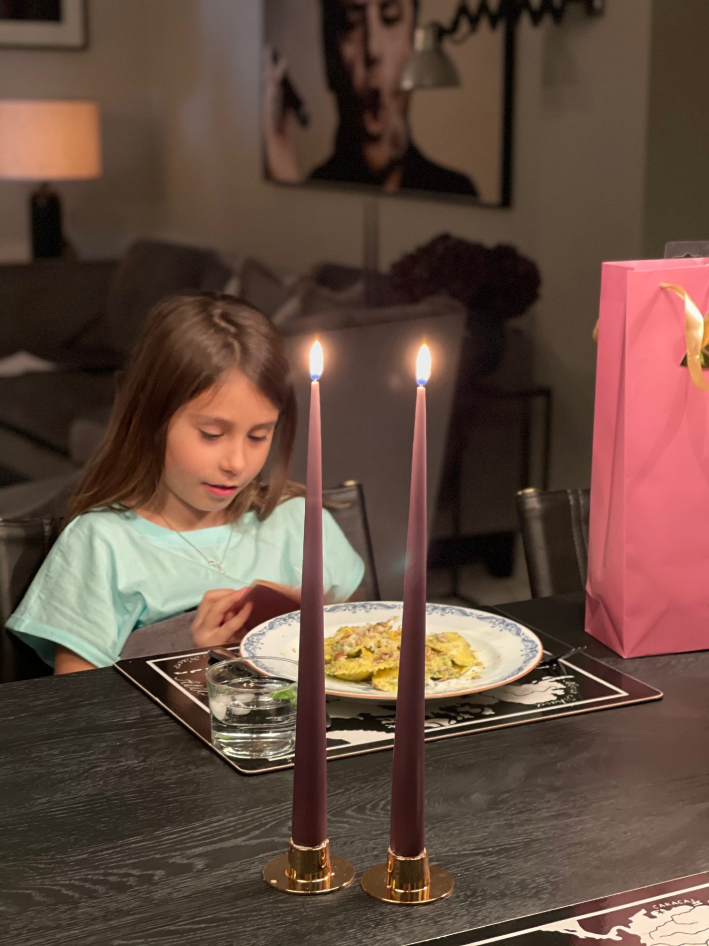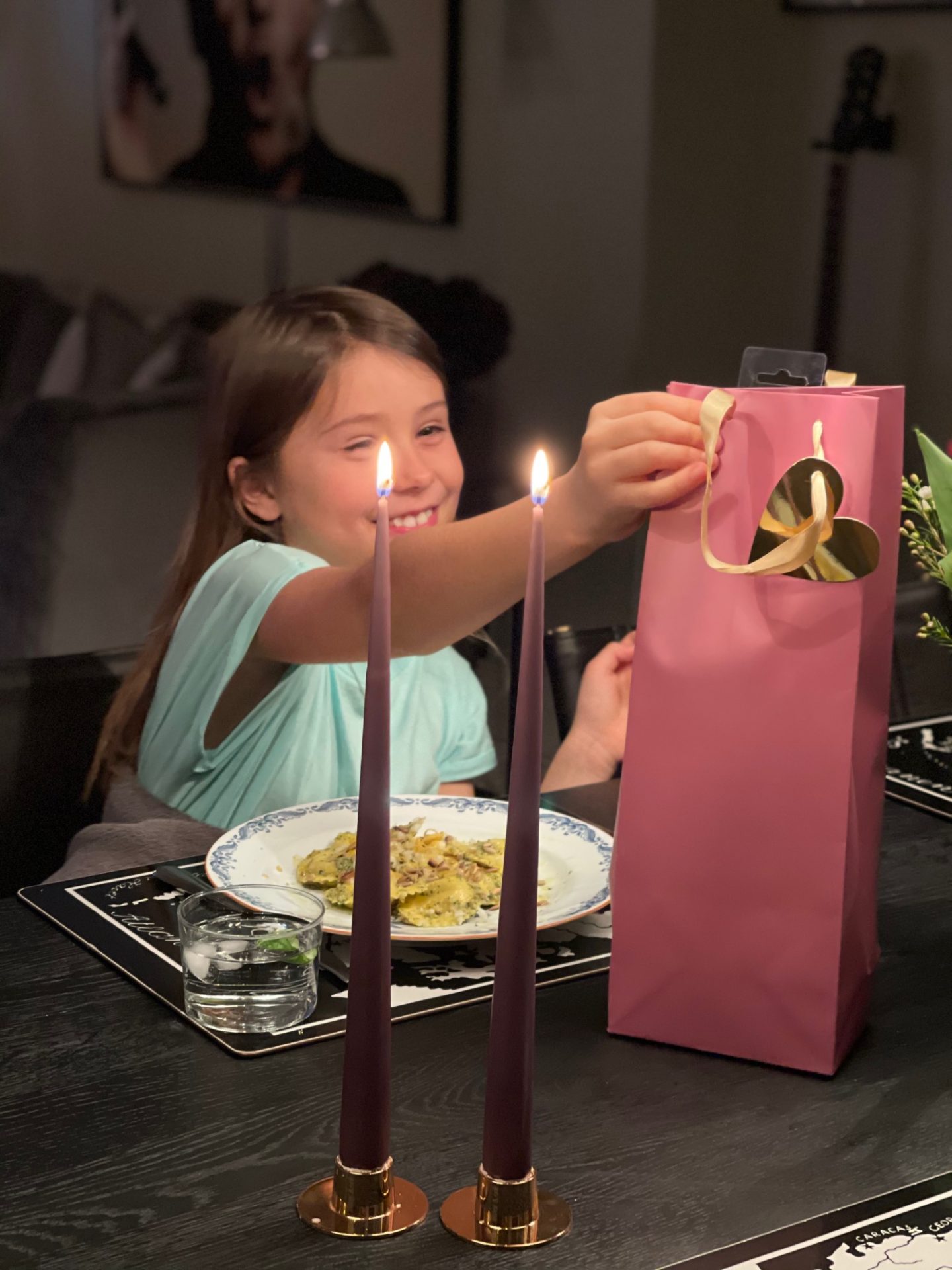 Jag panikåkte till ICA Maxi och shoppade en present och ett fint kort som jag ställde vid Aminas tallrik. Amina spenderade hela dagen hos en kompis då vi hade plåtning här hemma med allt tillhörande kaos från morgon till kväll.