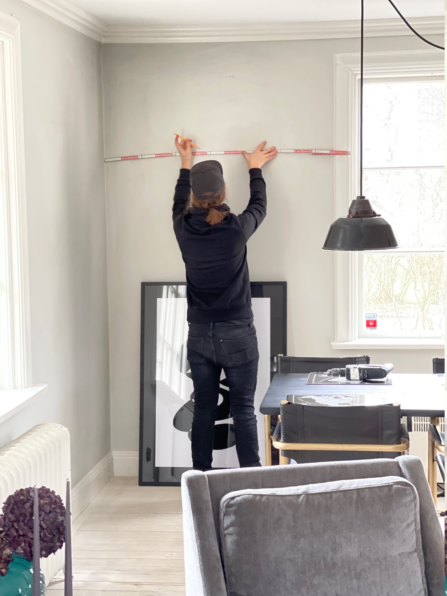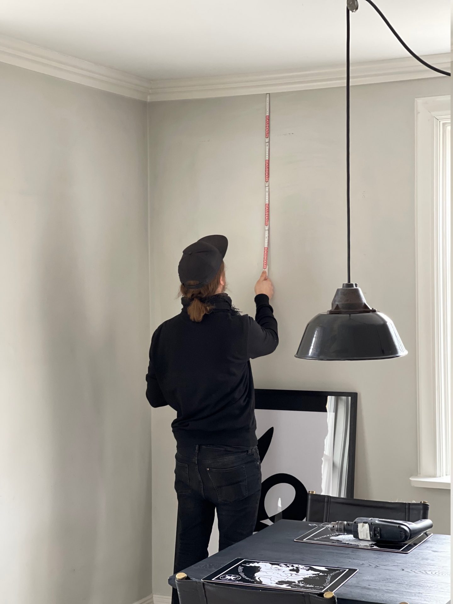 På ena sidan ska tavlan hänga och på den andra sidan ska Henrik bygga det platsbyggda skåpet som ska gå från golv till tak.