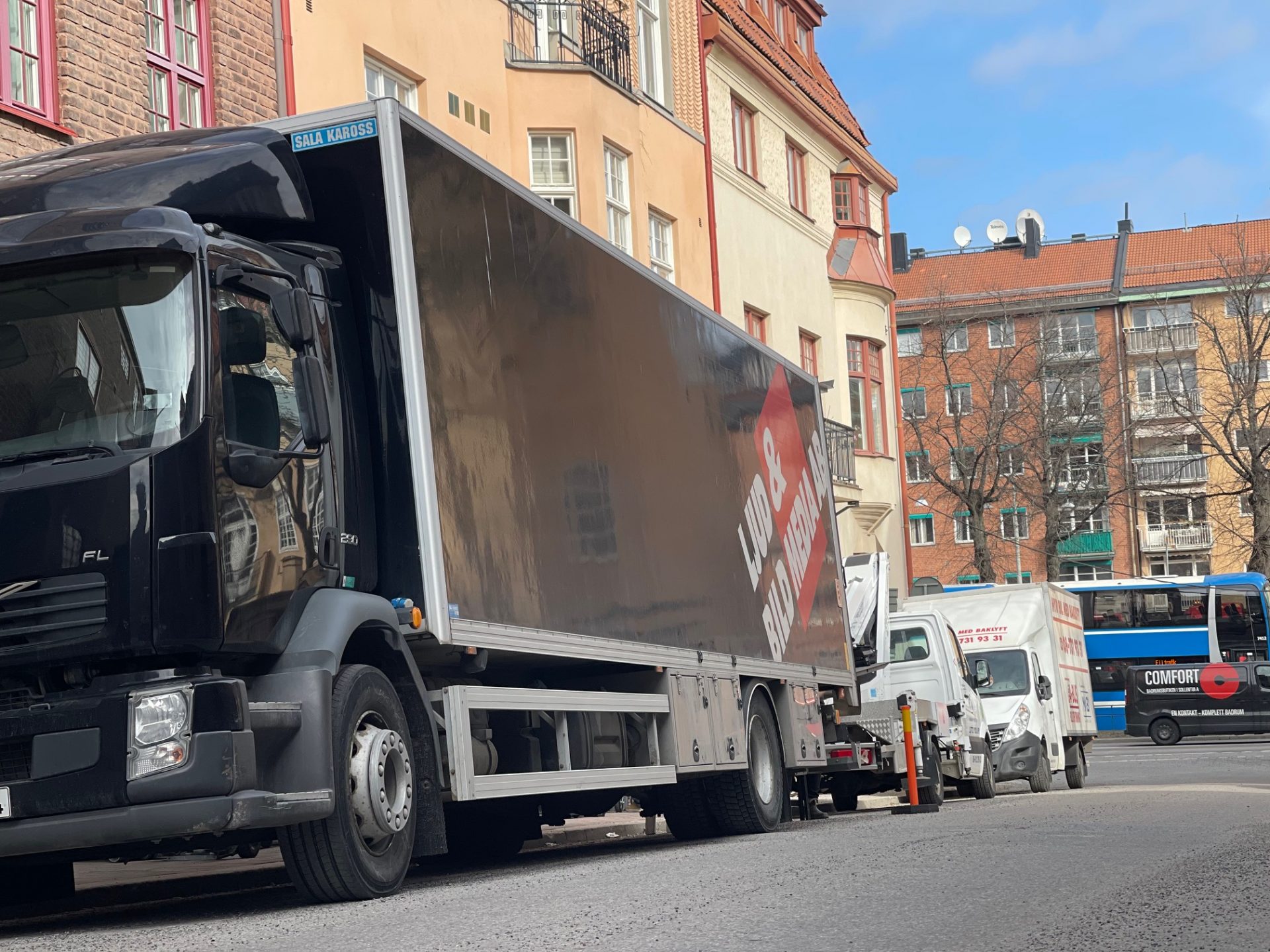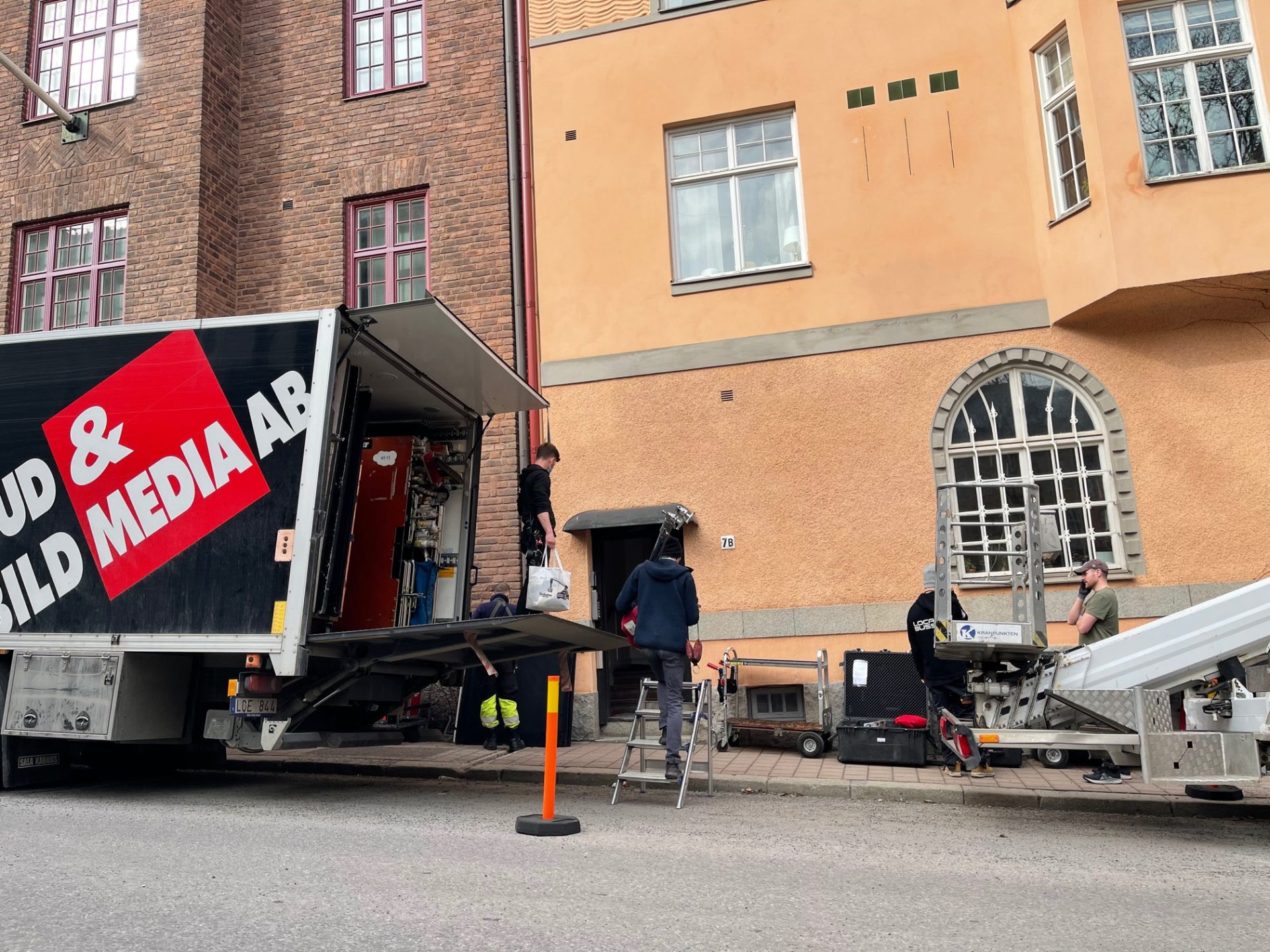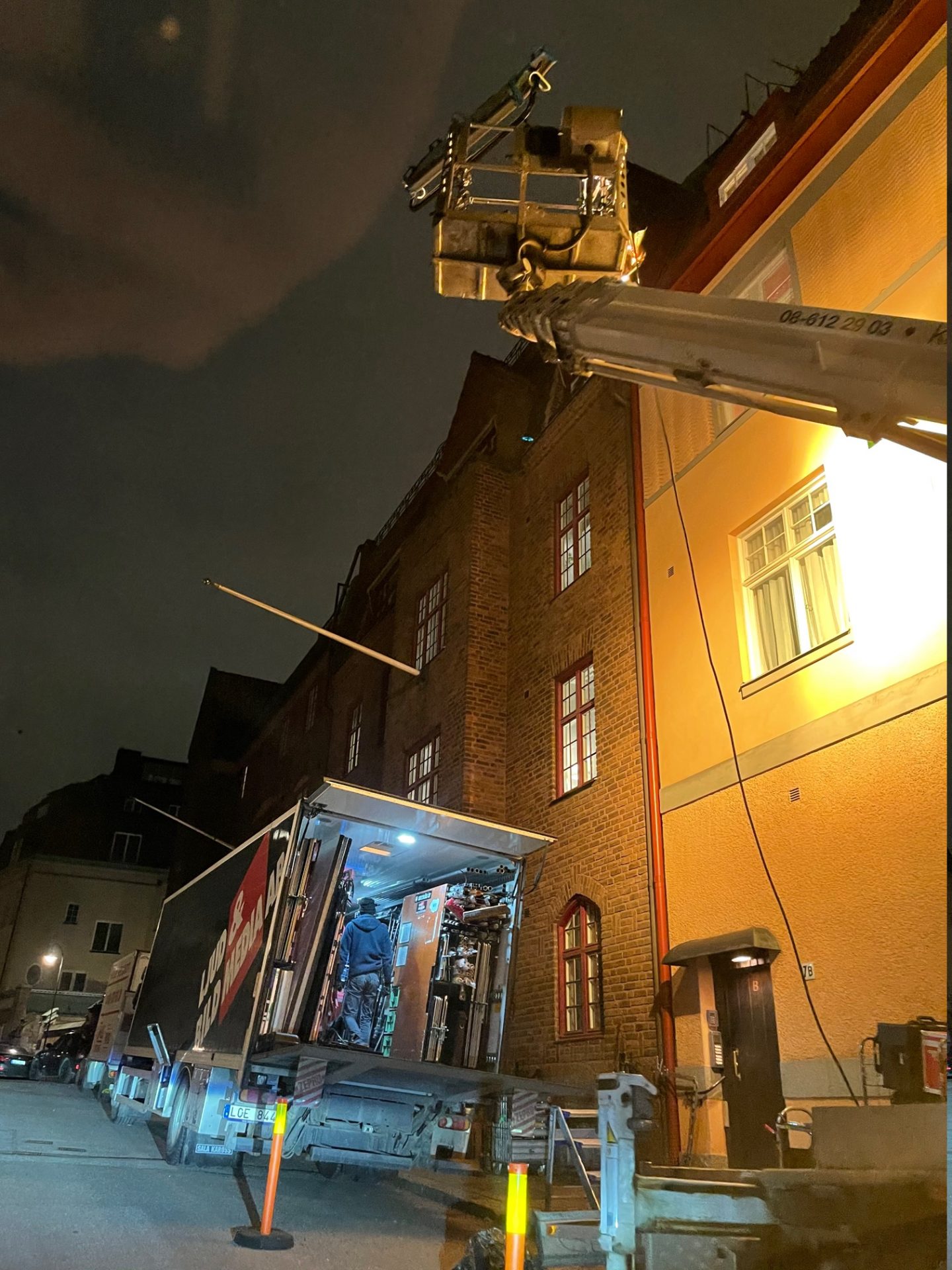 Det var en massa lastbilar och två kranbilar på gatan. Kranbilarna var där för att så snart det skymde skulle stora lampor upp i dom och lysa genom ett sovrumsfönster där en natt-scen skulle spelas in.