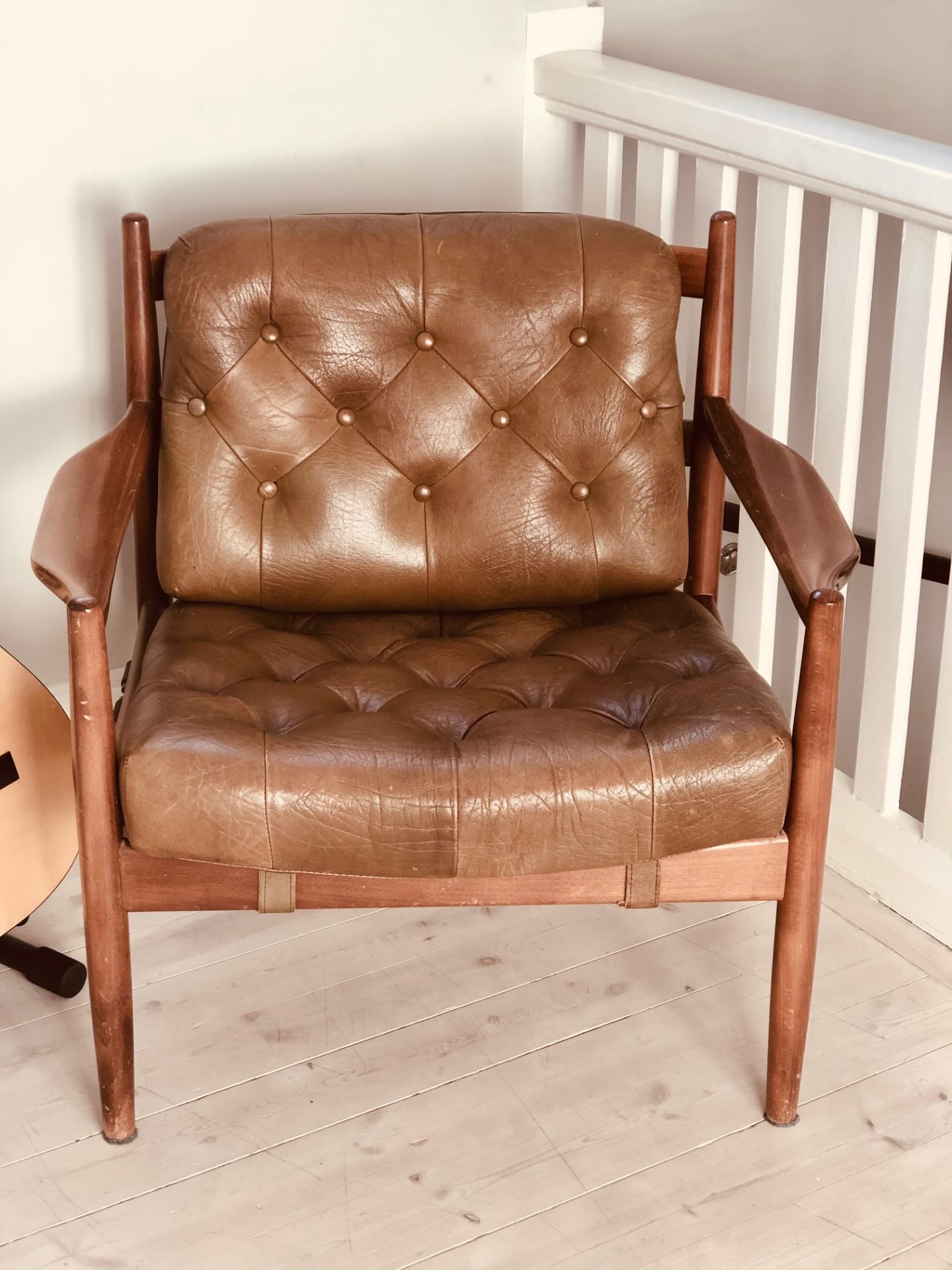 Jag har fått denna jättefina fåtölj och jag älskar den verkligen. Tyvärr är skinnet inte helt toppen och jag funderar på att ge den liten kärlek och omsorg.