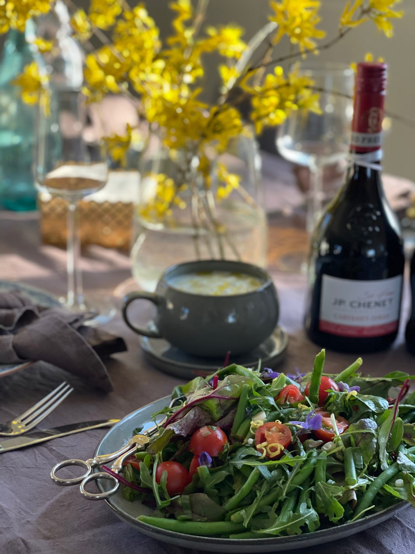 Jag hann inte ta något bild på den dö-goda potatisgratängen men här är en bild på salladen som dekorerats med nyplockade violer. Eftersom min dotter kom från ett jobbuppdrag som hon sen skulle fortsätta med efter middagen så serverades ett gott rött vin till maten.