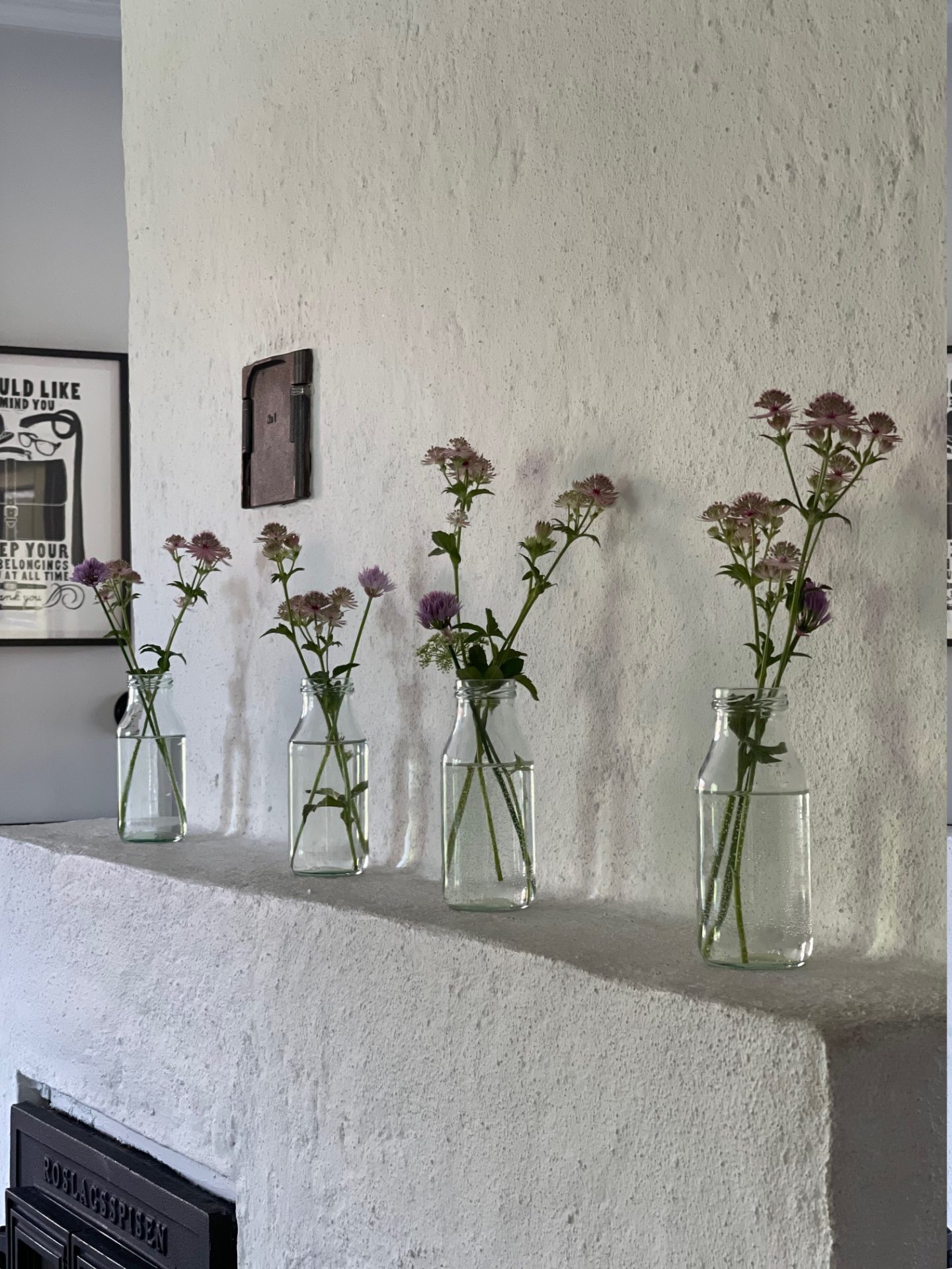 Jag sparar alltid på alla glasflaskor och burkar för allt kan användas som vaser. Här har jag klippt in lite blommor från trädgården och satt på hyllan på vår öppna spis. Fint va?