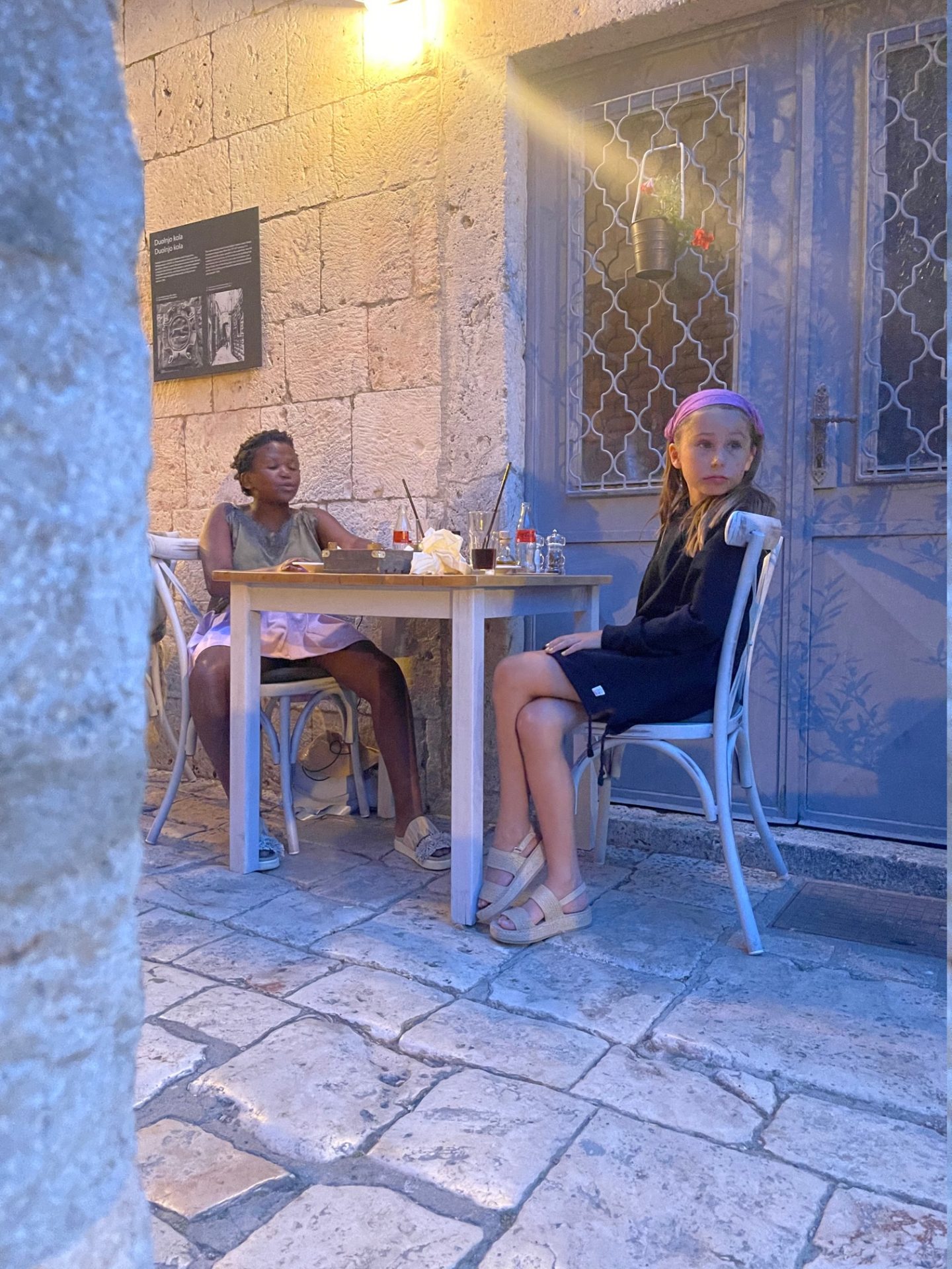 Tjejerna fick ett eget bord eftersom uteserveringen var i en gränd men det tyckte dom bara var roligt. Lite egentid kanske även barn kan behöva ibland.