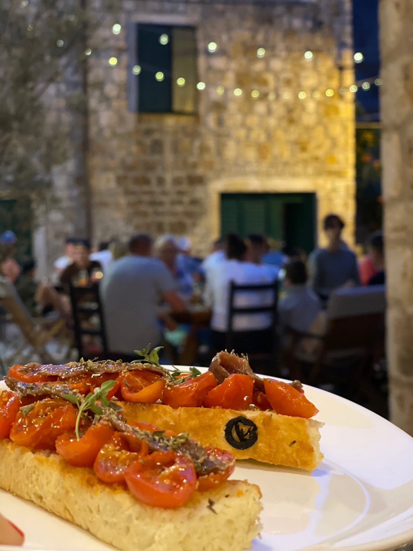 Efter badet gick vi och duschade och bytte om för kvällen och sen ut i byn för att leta ett bra ställe att äta middag på. Det var inte så mycket turister så bord fanns att få överallt. Vår skeppare Samuel tipsade varje kväll om restauranger och erbjöd sig redan på dagen att boka bord om vi önskade.