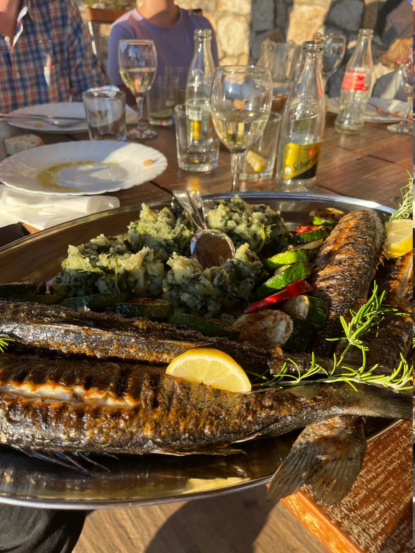 Här är måltiden vi alla sent ska glömma. Grillad nyfångad fisk med Kroatisk potatissallad som består av potatis och spenat. Så ofattbart gott!