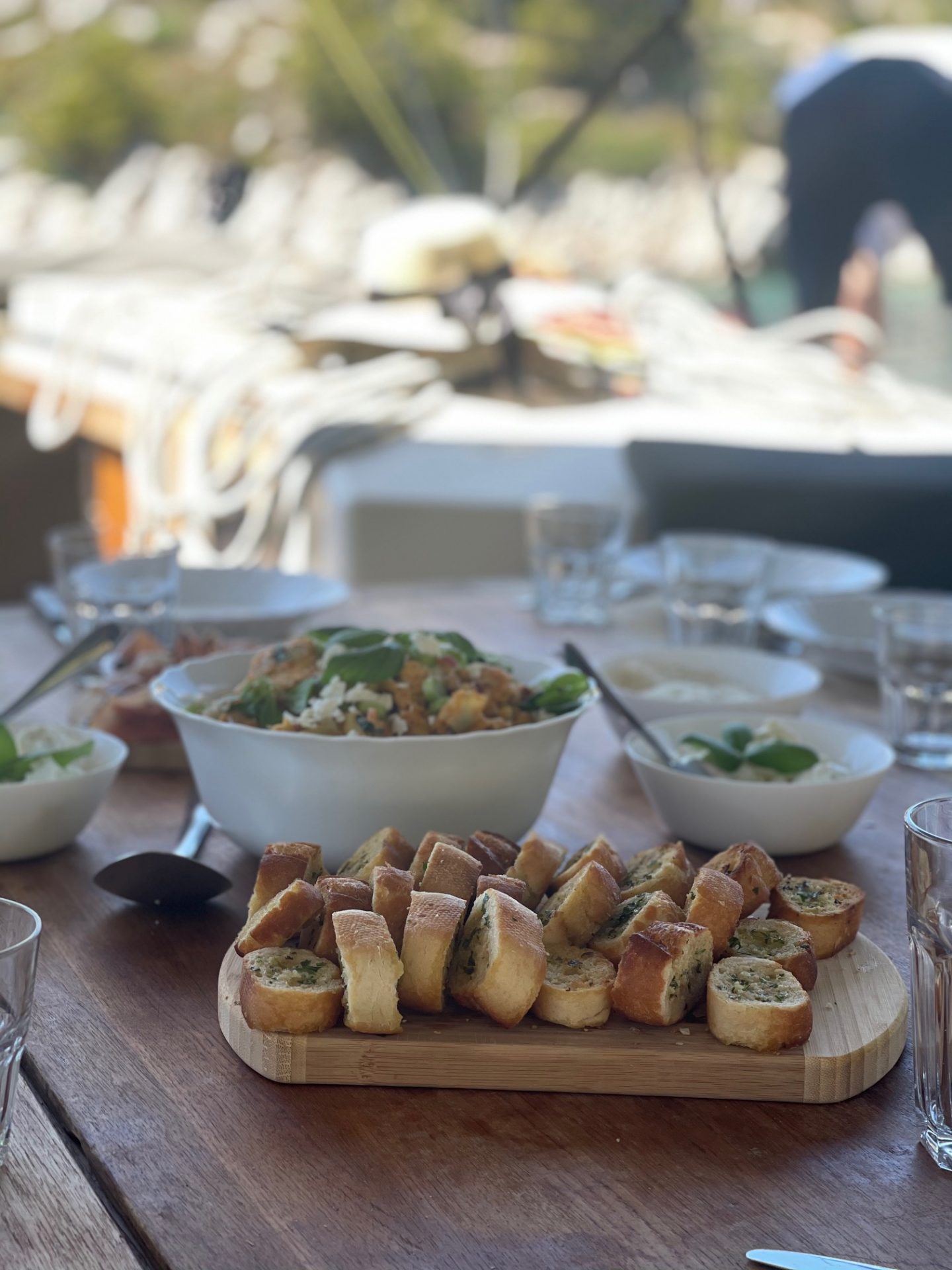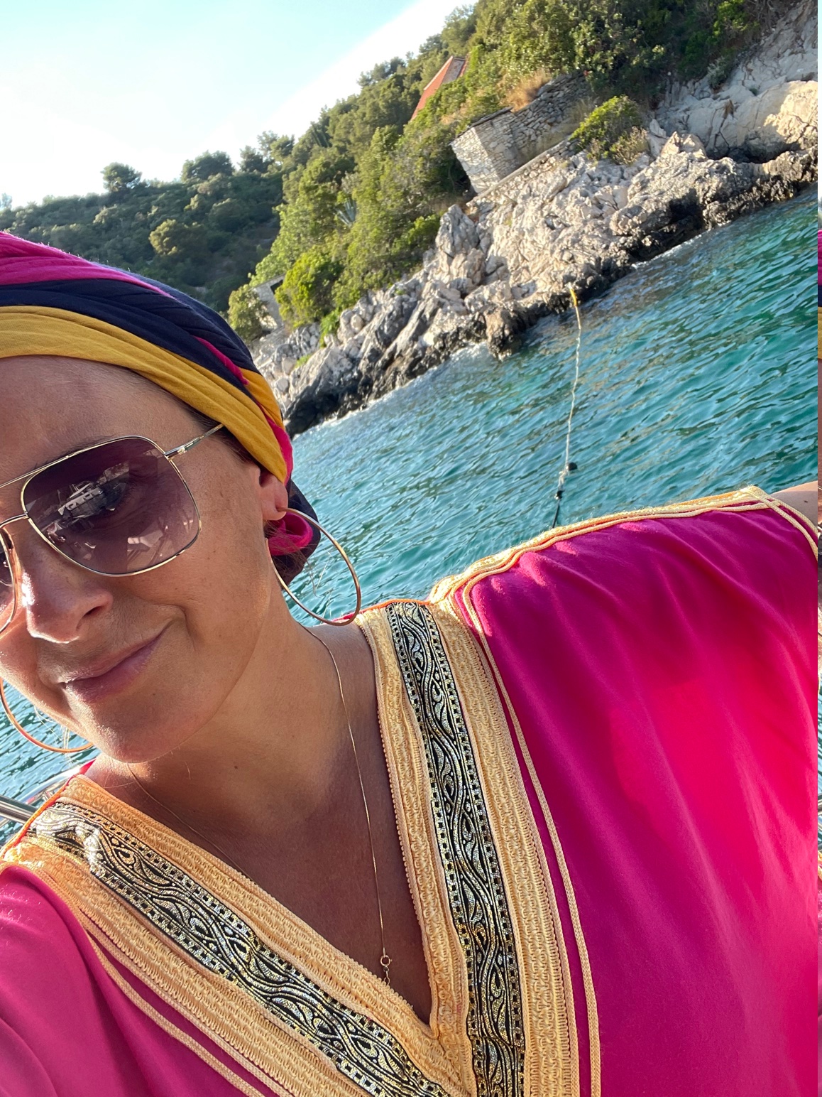 Mina kaftaner från Kaanda Beachlife kom väl till användning på den här resan. Dom passar som outfit på vilken restaurang som helst men också perfekt att sätta på sig efter ett bad för dom skrynklar inte. Jag är inte riktigt där i livet där jag gärna knixar runt på en båt, likblek med tajt röd baddräkt efter ett år med Corona-chips-diet. Däremot älskar jag kvinnor som äger sin Chipskropp, jag är snart där också men det får ta sin tid.