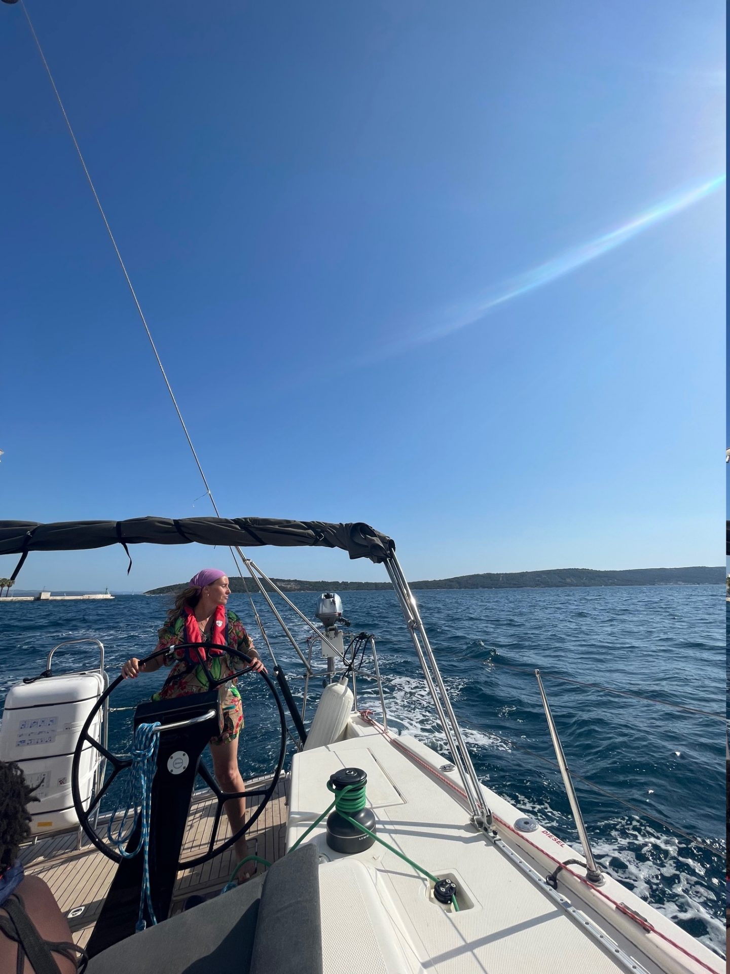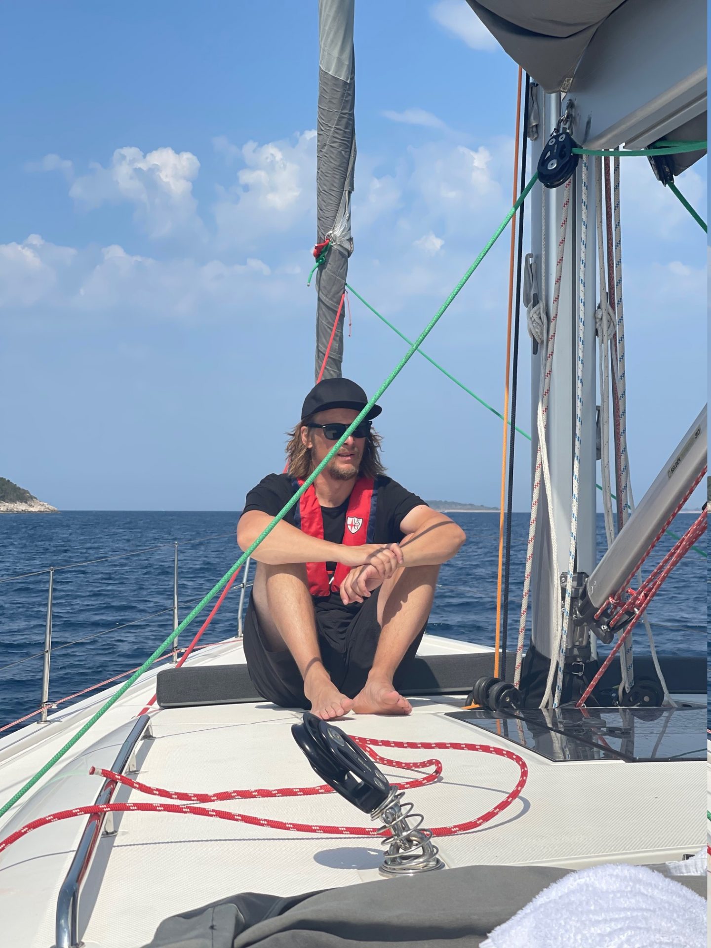 Henrik satt ofta längst fram med benen dinglandes utanför båten och med en bok i handen. Här sitter han och njuter av att få vara till havs. Han har ju seglat en exakt likadan båt själv och just här i Kroatien och kampanjat i evigheter att vi ska åka tillsammans.