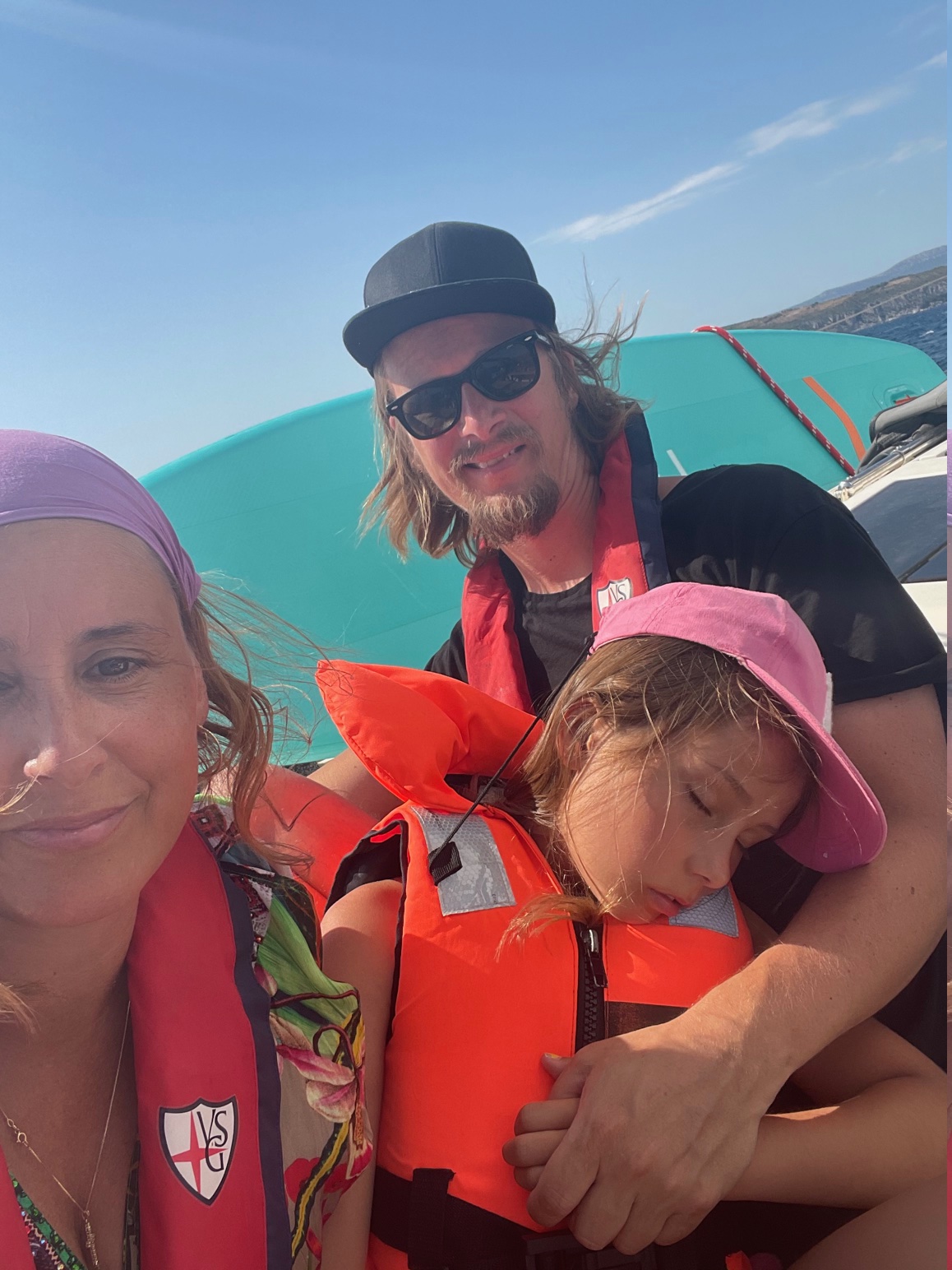 Efter lunch och bad somnade Amina och vi satt längst fram uppe på däck och njöt av resten av båtturen. Här är mitt hår så salt och knastrigt så att man skulle kunna bryta det itu.