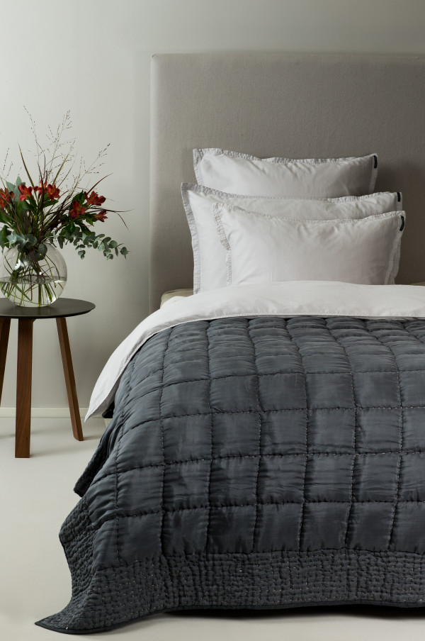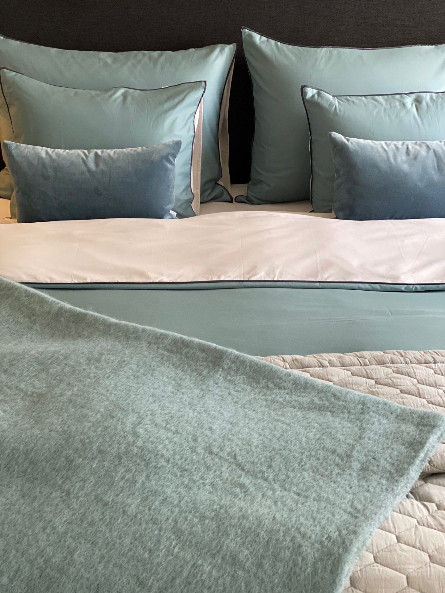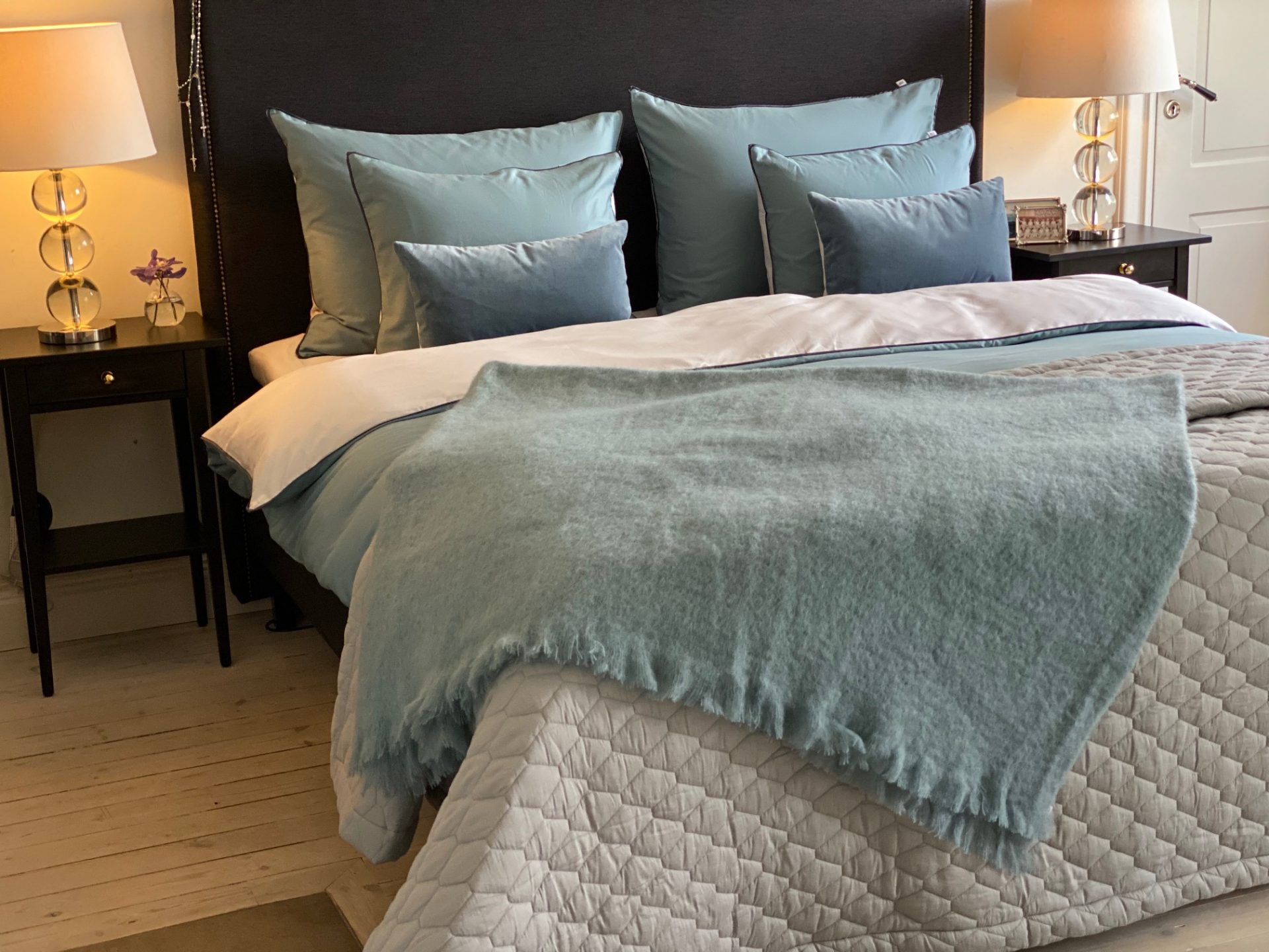 Det är väldigt fint med ett superstort överkast som går ner på båda sängens sidor. Det är inte superlätt att få tag i så breda överkast i Sverige, ofta så täcker dom bara halva sidorna tyvärr. När man har en högre säng med flera madrasser så kräver det ett ännu bredare överkast än standardmåtten. Bästa tipset är att måttbeställa ett överkast eller beställa från Himla, dom har riktigt stora överkast.