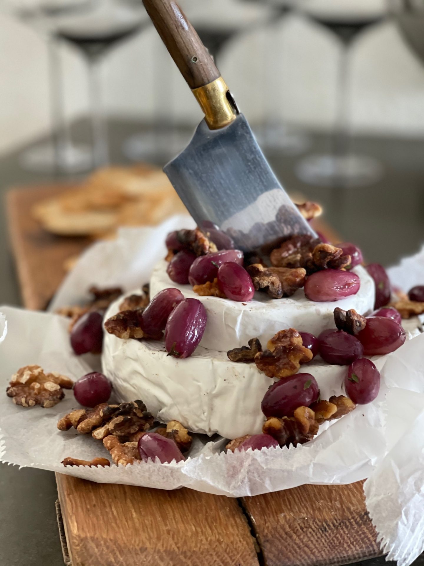 Till välkomstdrinken som bestod av både alkoholfria Nozecco och Arthur Metz Crémant d’Alsace Extra Brut för den som vill ha ett gott alkoholalternativ, serverade jag en ”osttårta” som är världens bästa för den värden/värdinnan som inte har oceaner av tid. Man placerar bara runda ostar på varandra som en tårta och sen brukar jag dekorera med rostade valnötter och röda vindruvor som har bakats i ugnen på låg värme.