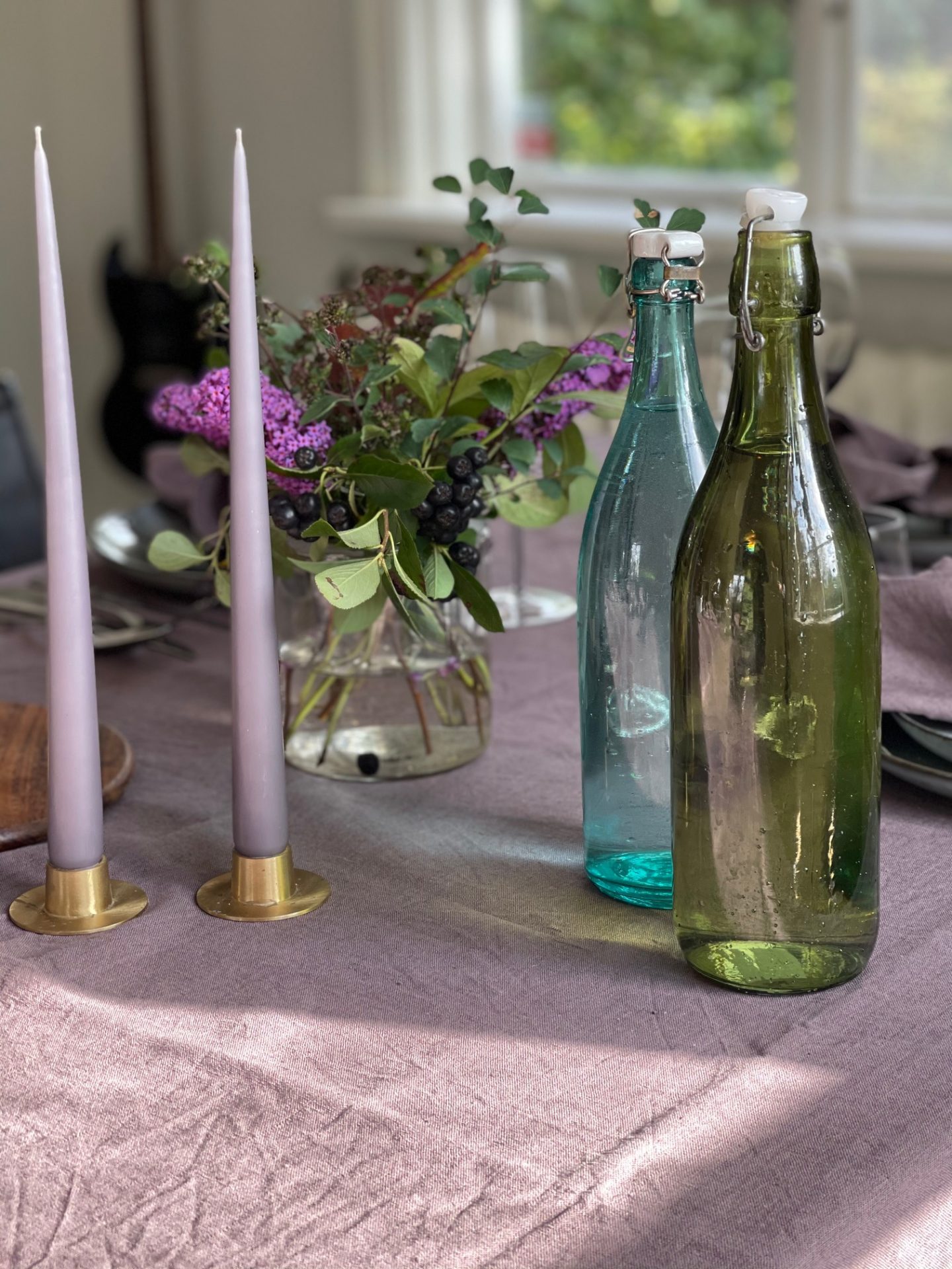 Jag tror btw att jag har alla lila nyanser som finns på ljus från Ester & Erik, både blanka och matta. Att duka med glasflaskor i färgat glas är verkligen ett hett tips om man vill få till den där extra detaljen som gör dukningen vacker och levande.