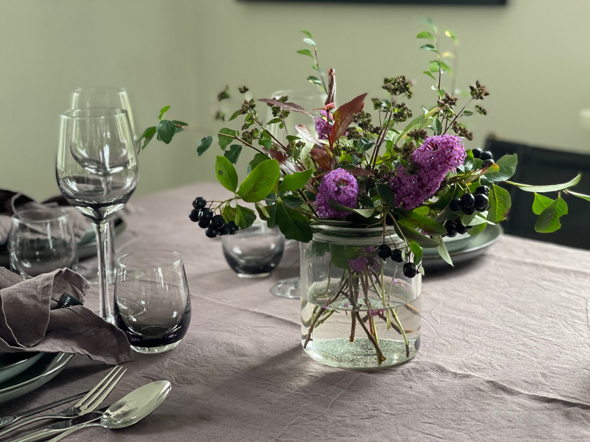 Som alltid när jag förbereder middagar så börjar jag med blommor. Jag går ut i trädgården eller naturen och hämtar sådant som för säsongen har fina färger. Just nu är det fullt med blad och annat i snygga röda, gula och lila färger (det finns några fördelar med höst aka osommar). Mina tallrikarna och dom vackra glasen i gråfärgat glas kommer från Lene Bjerre.